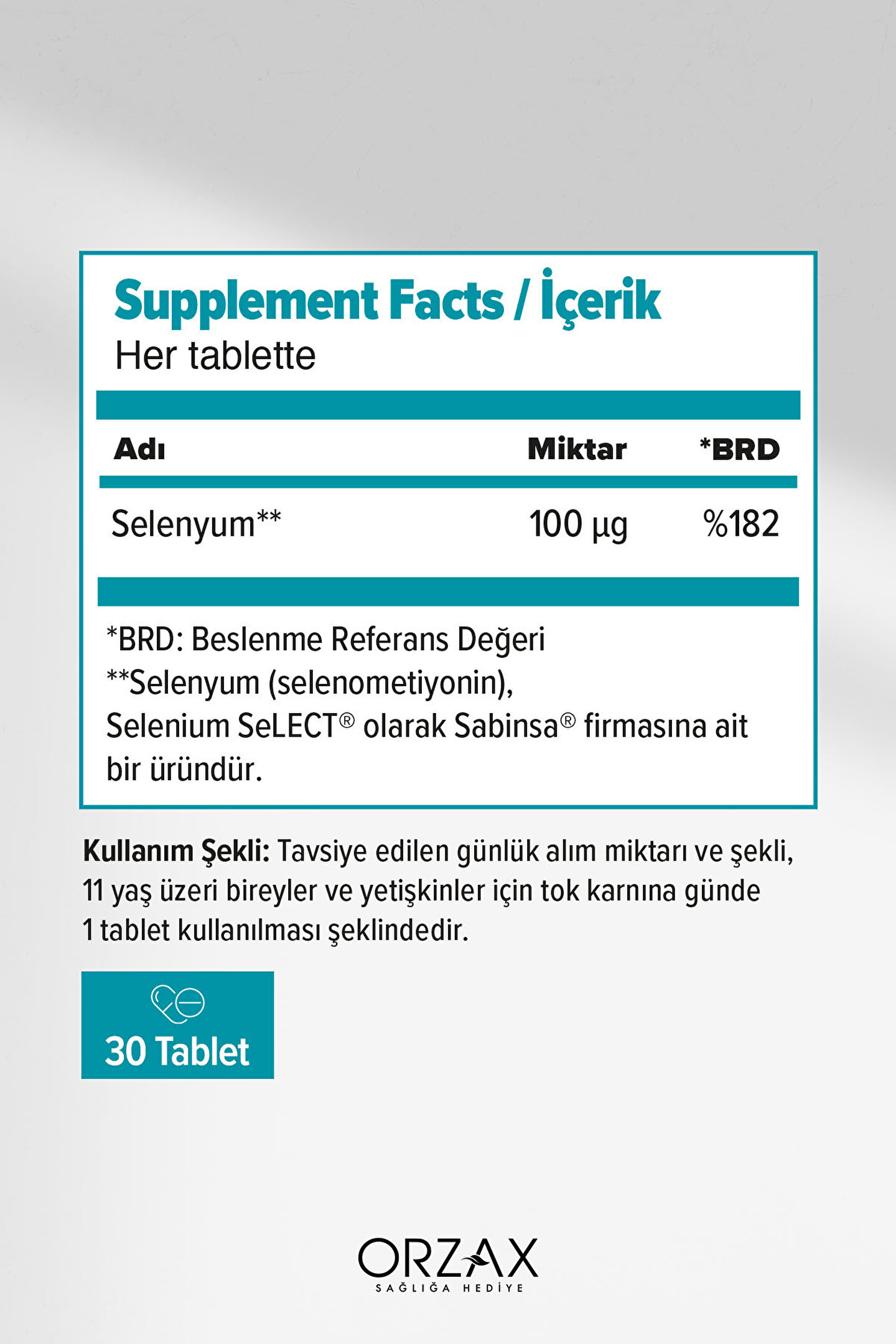 Ocean Selenyum, organik bağlı selenyum formlarından L-Selenometiyonin içeren bir gıda takviyesidir.; ADI MİKTARI *BRD **Selenyum 100 µg %182 *BRD: Beslenme referans değeridir.; **Selenyum (L-Selenometiyonin), Selenium SeLECT® olarak Sabinsa® firmasına ait bir üründür.; Tavsiye edilen günlük porsiyon miktarı ve şekli; 11 yaş üzeri bireyler ve yetişkinler için tok karnına günde 1 tablet kullanılması şeklindedir.