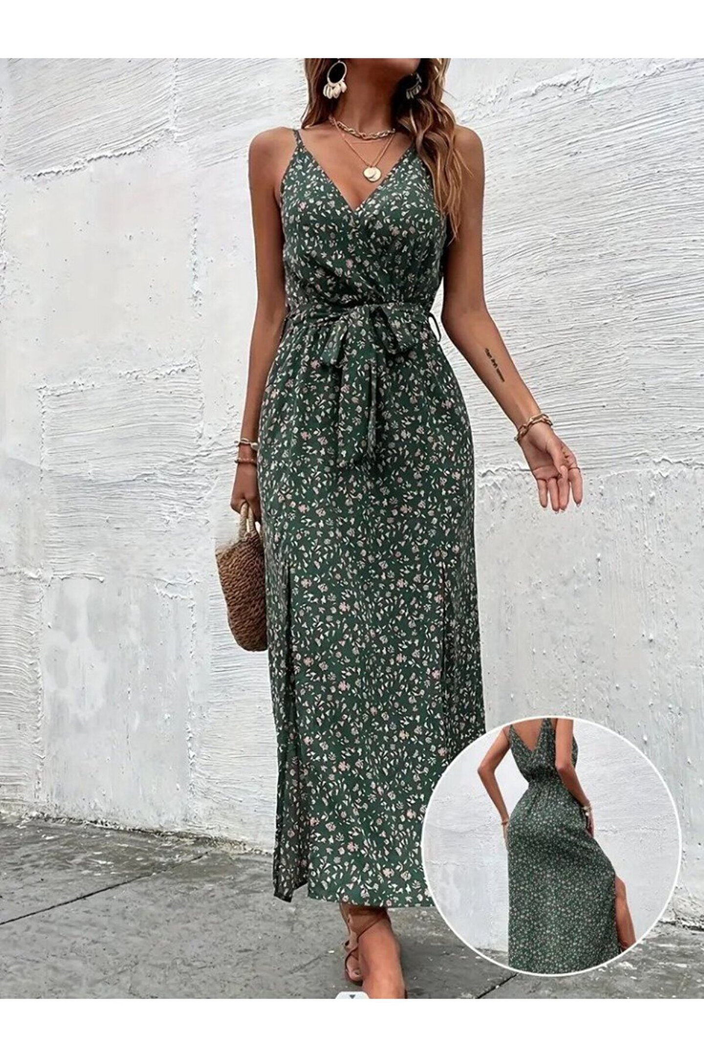 Omarı EQURİ Kadın Ip Askılı Kruvaze Yakalı Yırtmaçlı Uzun Desenli Kuşaklı Süprem Elbise