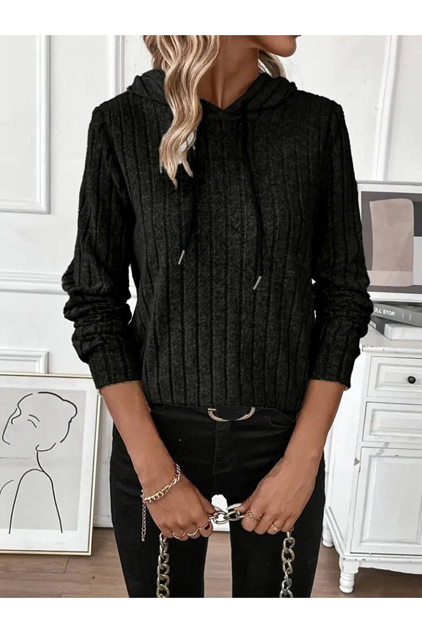 Kadın Uzun Kollu Kapşonlu Bağcıklı şardonlu Kaşkorse Bluz