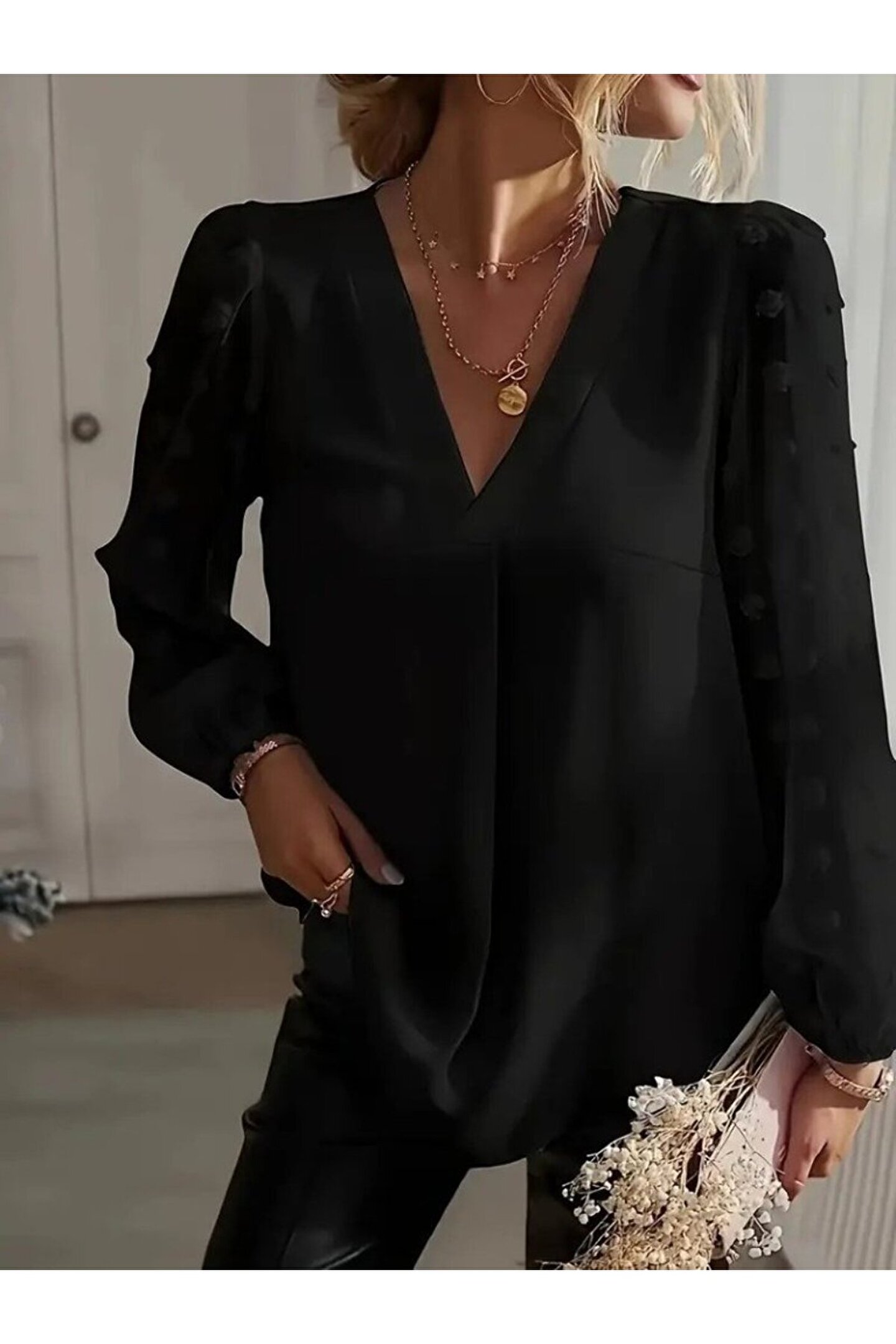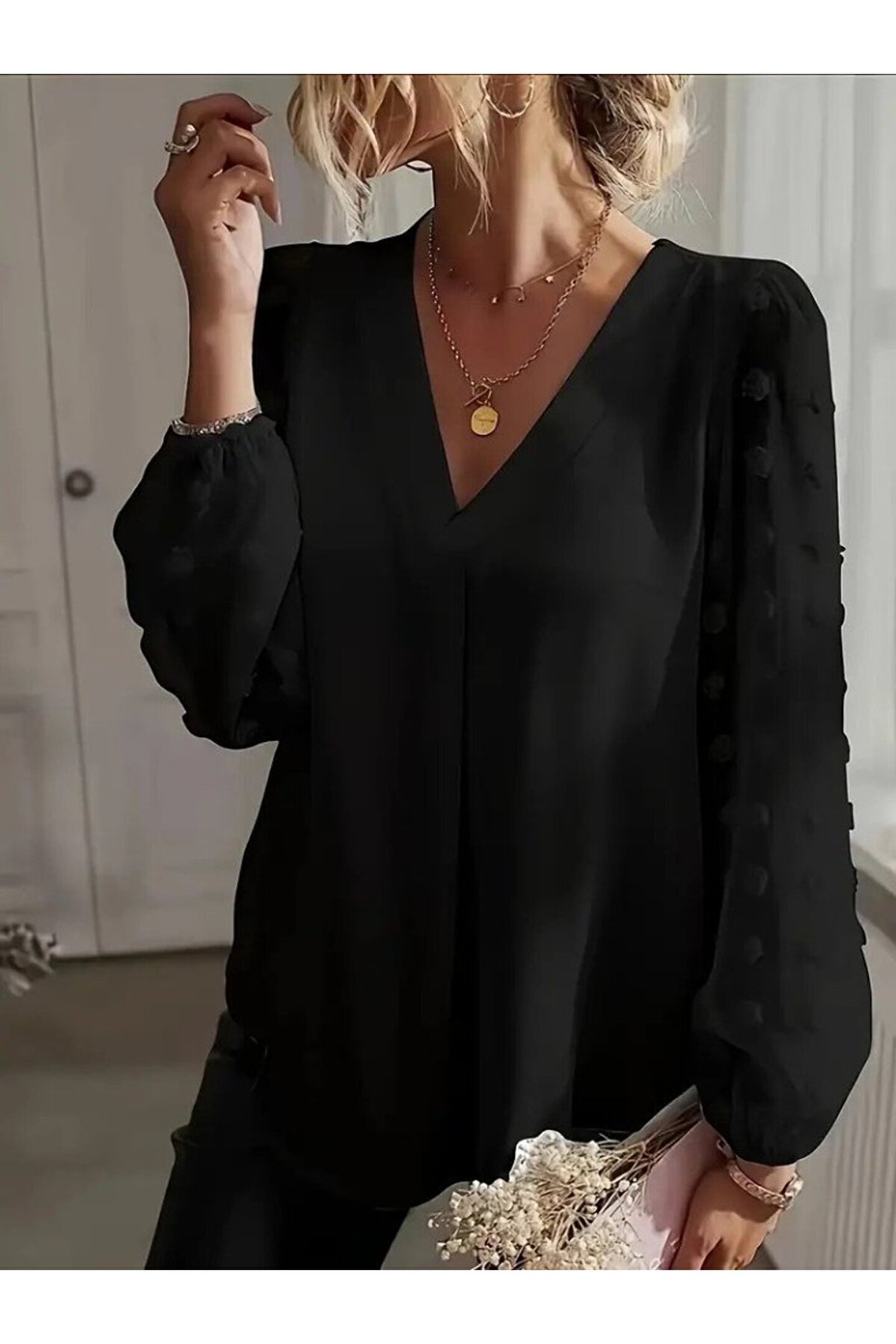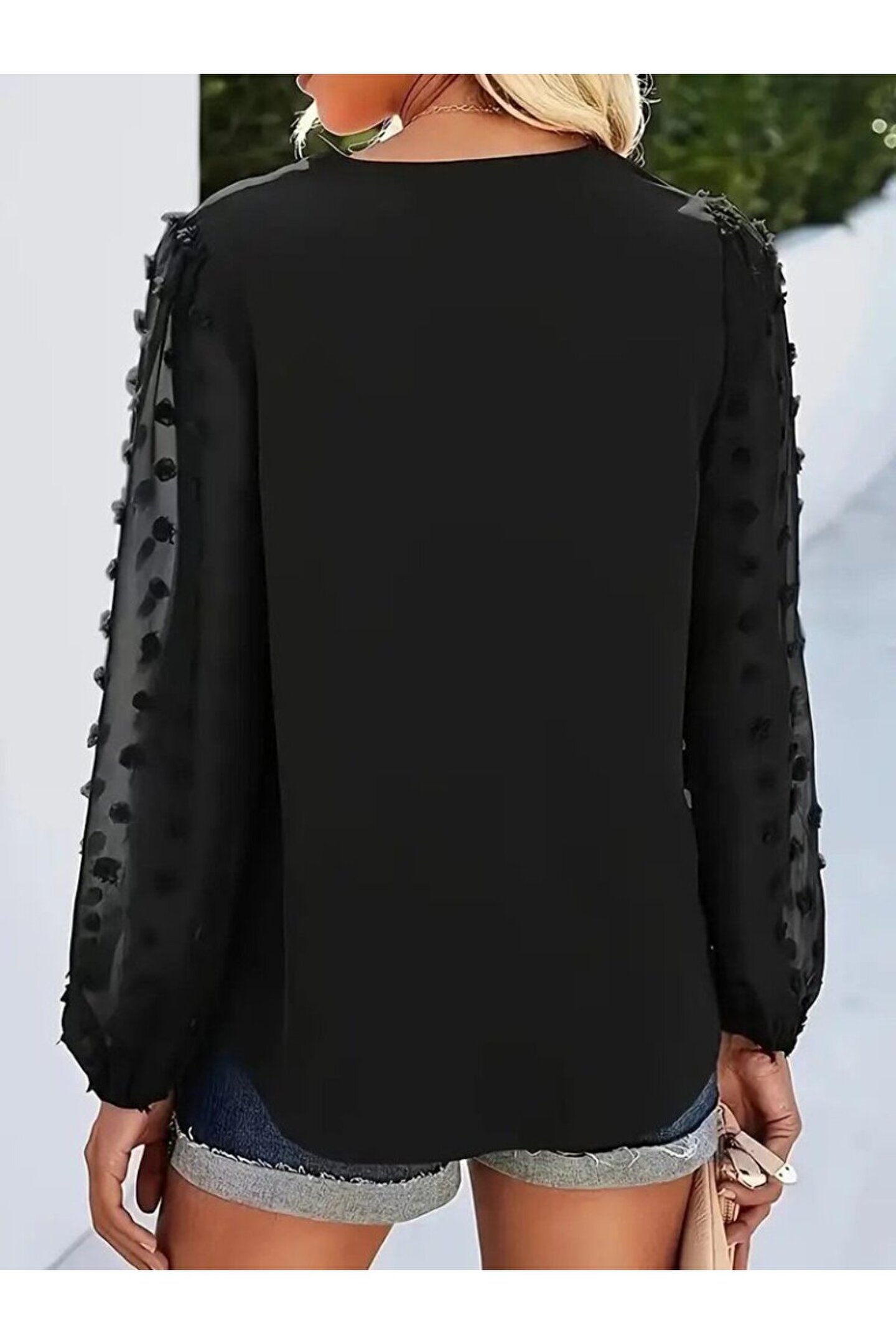 Kadın Uzun Kollu V Yakalı Kolları Popon Detaylı Sandy Bluz