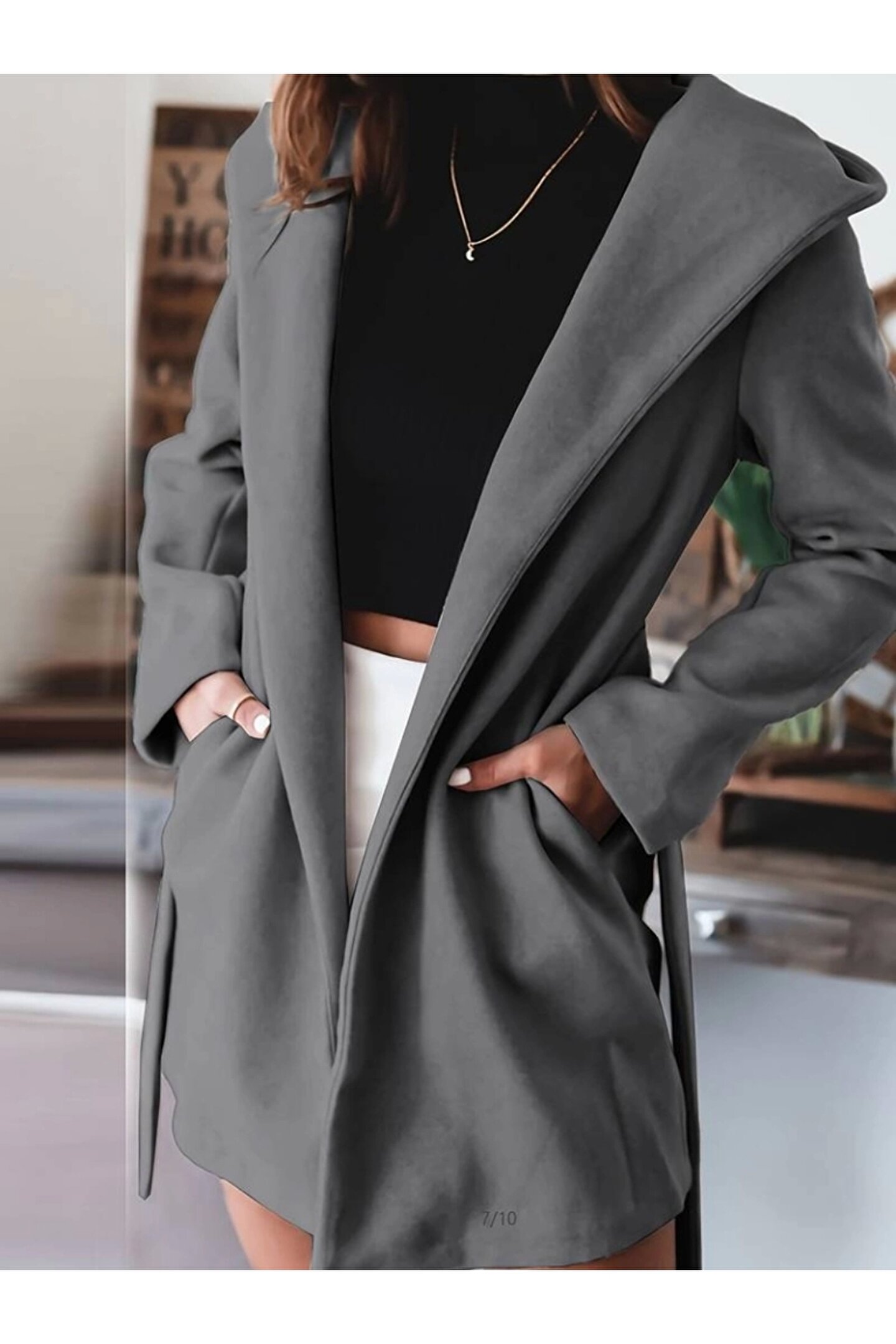 Kadın Uzun Kollu Belden Kuşaklı Kapşonlu Kısa Kaşe Kaban