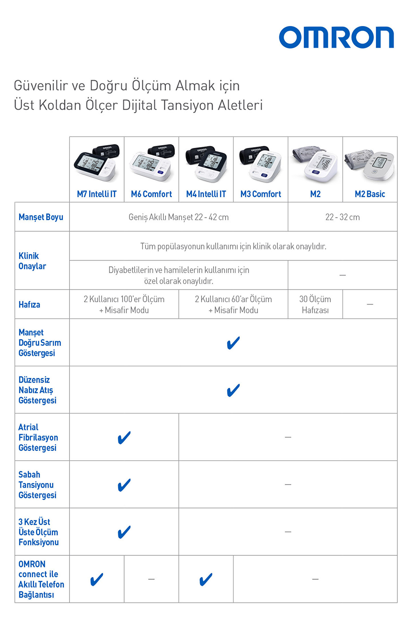 OMRON M2 Basic Dijital Tansiyon Aleti – Üst Koldan Otomatik Ölçüm, Intellisense Teknolojisi, Hipertansiyon Göstergeli, 5 Yıl Garantili;OMRON M2 Basic dijital tansiyon aleti, kolay kullanımı, yüksek ölçüm doğruluğu ve gelişmiş Intellisense teknolojisi ile güvenilir sonuçlar sunar.;Evde tansiyon takibi yapmak isteyenler için kardiyologların en çok tavsiye ettiği marka¹ olarak öne çıkar.;Öne Çıkan Özellikler;;- Hipertansiyon Göstergesi: Ölçüm sonucunun önerilen seviyenin üzerinde olup olmadığını kolayca gösterir.;- Intellisense Teknolojisi: Manşeti gereksiz yere aşırı şişirmeden konforlu ve doğru ölçüm sağlar.;- Kardiyolog Tavsiyesiyle 1 Numara¹: Avrupa genelinde kardiyologlar tarafından en çok önerilen tansiyon ölçüm cihazı markasıdır.;- Hafıza Özelliği: Tek kullanıcı için 1 ölçüm kaydı imkanı.;- Manşet Boyu: 22–32 cm kol çevresine uygundur.;- Klinik Olarak Doğrulanmıştır: Tıbbi güvenilirliği test edilmiştir.;- 5 Yıl Garantili: Uzun ömürlü kullanım için üretici garantisi.;- Kantar Health (2023) Araştırması Sonuçlarına Göre:;Avrupa genelindeki (EU9) kardiyologların en çok önerdiği tansiyon ölçüm cihazı markası OMRON olmuştur.;Kutu İçeriği;;- OMRON M2 Basic Tansiyon Aleti (Ana Ünite);- Manşet (22–32 cm);- Kullanım Kılavuzu 1 ve 2 (Türkçe dahil);- Piller (4 Adet AA Pil)