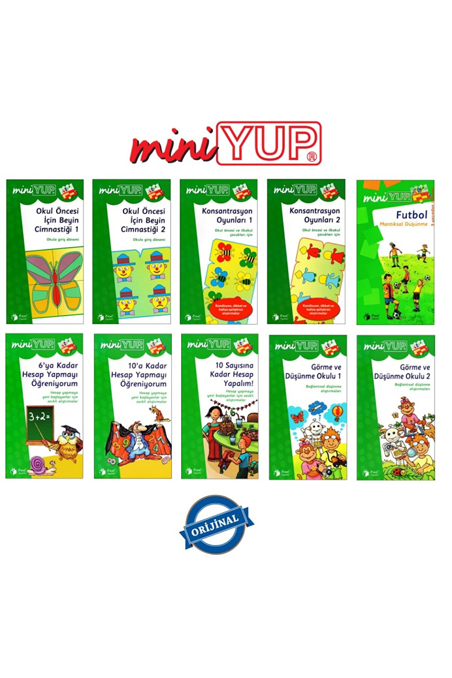 miniYUP 5-7 Yaş Avantajlı Paket (30 kitap + 1 miniYUP Kontrol Kutusu) Ambalaj Ebat: 16,5 x 38,5 x 7,5cm Kitapçık Sayısı: 30 adet Kitapçık Ebat: 14 ?x 26 cm Toplam Alıştırma Sayısı: 399 adet Baskı: Renkli / Siyah-Beyaz Çocuklarımızın gelişim dönemlerindeki ilk yıllar, gelişimin en hızlı olduğu ve çevrenin etkisine en açık olan dönem olduğundan yola çıkarak, çocuklarımızın çok yönlü gelişimine sosyal, zihinsel, duygusal, dilsel ve fiziksel destek verecek uyarıcıların onlara sunulması gerekmektedir.; Başta Avrupa olmak üzere dünya çapında 35 ülke ve 20 farklı dilde çocuklara hem oyun keyfini, hem de öğrenme başarısını bir arada yaşatan YUP (Yap-Uygula-Pekiştir) Eğitim Materyali, bazı kurumlar tarafından IQ testi, bazı okullarca da ders materyali olarak kullanılmaktadır.; Konsantrasyon, zeka geliştirme, beyin jimnastiği, matematik ve yabancı dil gibi temel hedef kazanımları, bireysel farklılıkları göz ardı etmeksizin ihtiyaçlar doğrultusunda, Howard Gardner’in “Çoklu Zeka Kuramı” ve Benjamin Bloom’un “Eğitim Amaçları Taksonomisi” gibi bilimsel altyapı ile birleştiren YUP (Yap-Uygula-Pekiştir) Eğitim Materyali, 2 ile 14 yaş aralığındaki çocuklarımız için ideal olup, özellikleri ve kazanımları şu şekildedir: YUP SİSTEMİNİN ÖZELLİKLERİ Bilgilerin çocuğa kodlanarak değil, oyunla verilmesi; Öğrenmenin sıkıcı bir görevden, neşeli bir oyuna dönüşmesi; Oyunu ve öğrenmeyi mantıklı bir şekilde birleştirme; Kolay anlaşılır olma; Sistemli çalışmayı öğretme ; Sürprizlere açık olmayı öğretme ve serüven duygusu verme; Yaratıcılığı destekleme ve yaratıcılığa teşvik etme; Öğrenmeye hazır olma istekliliği yaratma; Rekabet baskısını ortadan kaldırıp kendi kendine yarışma yaratma; Kolaydan zora ve basitten karmaşığa öğrenmeyi kolaylaştırma; Bilimsel kurallara dayalı sistematik öğrenme; Kendi kendini sınama ve deneme; YUP SİSTEMİNİN KAZANIMLARI El, göz ve beyin koordinasyonu sağlama; Kavrama, algılama ve gözleme yeteneklerini geliştirme; Hassas hareket yeteneğinin güçlendirilmesi; Yaratıcılığa destek ve teşvik; Konsantrasyonun geliştirilmesi; Korku ve yarışmayı duygusunu yenme; Görsel algılamanın iyileştirilmesi; Özgüven ve sorumluluk duygusunu güçlendirme; Otokontrol sistemiyle kendi başarısını ölçebilme; Kendi aklını kullanarak doğru ile yanlışı ayırabilme ve sabırlı olabilme; Bireysel çalışmayı teşvik etme; Düşündürerek öğretme ve düşünerek öğrenme; 30 adet olan kitapçıkların sıralaması ise şu şekildedir: Okul Öncesi Beyin Jimnastiği 1; Okul Öncesi Beyin Jimnastiği 2; Konsantrasyon Oyunları 1; Konsantrasyon Oyunları 2; Futbol - Mantıksal Düşünme; 6'ya Kadar Hesap Yapmayı Öğreniyorum; 10'a Kadar Hesap Yapmayı Öğreniyorum; 10 Sayısına Kadar Hesap Yapalım!; Görme ve Düşünme Okulu 1; Görme ve Düşünme Okulu 2; Yaşasın! Okula Başlıyorum!; Kahvaltı Keyfiyle Hesap Yapalım!; Tanıma ve Sayma; Şekil ve Konum; Toplama ve Birleştirme; Şekil ve Yer; Toplama ve Çıkarma; Tamamlama ve Yerine Yerleştirme; Renkler ve Şekillerle Bilmeceler 1; Renkler ve Şekillerle Bilmeceler 2; Düşünme Olimpiyatları 1; Düşünme Olimpiyatları 2; Görsel Algılama Alıştırmaları 1; Görsel Algılama Alıştırmaları 2; Gör ve Kavra 1; Gör ve Kavra 2; Düşünme Oyunları 1; Düşünme Oyunları 2; Zeka Geliştirme Oyunları 1; Zeka Geliştirme Oyunları 2; *Kitapçıkların hepsi miniYUP Kontrol Kutusu ile uygulanmaktadır.;
