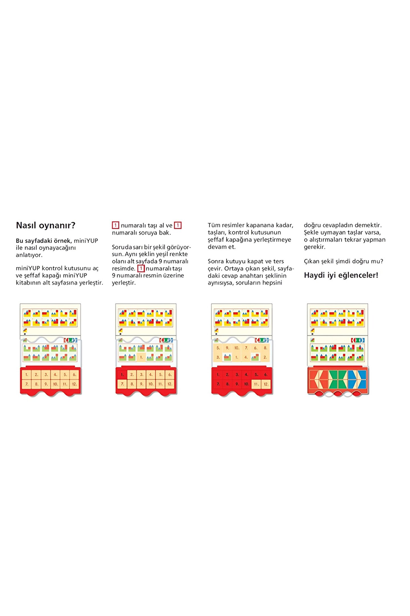 miniYUP 6-8 Yaş Mantık Oyunları Seti (Kontrol Kutusu Dahil Değildir) YUP Eğitim Sistemi’nde orta basamak olup öğrenmenin etkin rol oynadığı MiniYUP Serisi’nin sıralı yaş grubuna göre ilk seti olan ve her birinde 12 soru bulunan toplam 120 etkinliğin bulunduğu 10 etkinlik kitabı ve 1 Kontrol Kutusundan oluşan MiniYUP 5+ Yaş Eğitim Seti’nde, bireysel farklılık faktörü göz ardı edilmeksizin 5 yaş ve üzeri çocukların karmaşık ve renkli nesneleri, eşyaları, şekilleri, desenleri ve motifleri tanımaları; sayma, sayı ve 10’a kadar hesap işlemlerini yapabilmeleri amaçlanmaktadır. Kitapçıklarda yer alan görsel, aynı ya da benzer görseller ile kontrol kutusu adı verilen bir düzenek sayesinde eşleştirilir ve kontrol edilir. Almanya menşeli olup, 50 ülke ve 18 dilde yayınlanan “Oynayarak Öğrenme” felsefesine dayalı bu sistem evrensel olarak LÜK adını alırken, Kanada’da Veritech, Avustralya’da Tutor Systems, Japonya’da Toppan, İsveç’te LYCK, Venezüella’da Arco, Hollanda’da LOCO ve Türkiye’de de YUP adını almaktadır. *Kitapçıkların hepsi miniYUP Kontrol Kutusu ile uygulanmaktadır. SİSTEMİN KAZANIMLARI • El, göz ve beyin koordinasyonu sağlama • Kavrama, algılama ve gözleme yeteneklerini geliştirme • Hassas hareket yeteneğinin güçlendirilmesi • Yaratıcılığa destek ve teşvik • Konsantrasyonun geliştirilmesi • Korku ve yarışma duygusunu yenme • Görsel algılamanın iyileştirilmesi • Özgüven ve sorumluluk duygusunu güçlendirme • Otokontrol sistemiyle kendi başarısını ölçebilme • Kendi aklını kullanarak doğru ile yanlışı ayırabilme ve sabırlı olabilme • Bireysel çalışmayı teşvik etme • Düşündürerek öğretme ve düşünerek öğrenme SİSTEMİN ÖZELLİKLERİ • Bilgilerin çocuğa kodlanarak değil, oyunla verilmesi • Öğrenmenin sıkıcı bir görevden, neşeli bir oyuna dönüşmesi • Oyunu ve öğrenmeyi mantıklı bir şekilde birleştirme • Kolay anlaşılır olma • Sistemli çalışmayı öğretme • Sürprizlere açık olmayı öğretme ve serüven duygusu verme • Yaratıcılığı destekleme ve yaratıcılığa teşvik etme • Öğrenmeye hazır olma istekliliği yaratma • Rekabet baskısını ortadan kaldırıp kendi kendine yarışma yaratma • Kolaydan zora ve basitten karmaşığa öğrenmeyi kolaylaştırma • Bilimsel kurallara dayalı sistematik öğrenme • Kendi kendini sınama ve deneme 2 adet olan kitapçıkların sıralaması ise şu şekildedir: Mantıksal Düşünme Mantıksal Sıralama YUP® nedir? YUP, kelime anlamı olarak "Yap-Uygula-Pekiştir” fiillerinin baş harfleri ile oluşturulmuş, 2010 yılından beri güncelliğini koruyan TPE nezdinden markalaştırılmış bir eğitim sistemidir. Kaynağı Almanca Lernen-Üben-Kontrollieren (Öğren-Uygula-Kontrol Et) fiillerinden oluşturulmuş LÜK markasıdır. YUP, içerisinde 2 yaşından 10 yaşına kadar zeka, dikkat, konsantrasyon, matematik ve yabancı dil gibi temel kazanımlara yönelik alıştırmalar barındıran bir eğitim sistemidir.