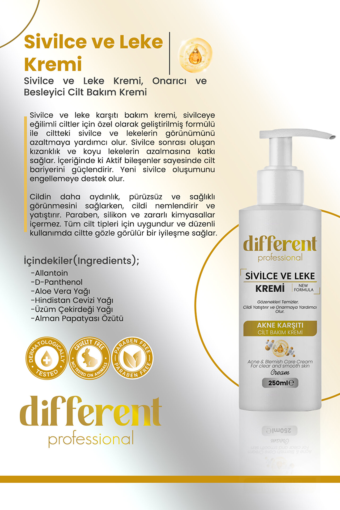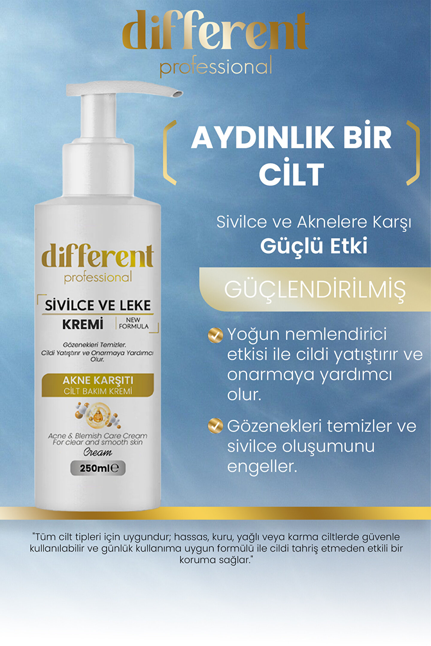 ve leke karşıtı bakım kremi, ye eğilimli ciltler için özel olarak geliştirilmiş formülü ile ciltteki ve lekelerin görünümünü azaltmaya yardımcı olur.; sonrası oluşan kızarıklık ve koyu lekelerin azalmasına katkı sağlar.; İçeriğinde ki Aktif bileşenler sayesinde cilt bariyerini güçlendirir.; Yeni oluşumunu engellemeye destek olur.; Cildin daha aydınlık, pürüzsüz ve sağlıklı görünmesini sağlarken, cildi nemlendirir ve yatıştırır.; Paraben, silikon ve zararlı kimyasallar içermez.; Tüm cilt tipleri için uygundur ve düzenli kullanımda ciltte gözle görülür bir iyileşme sağlar.; Kullanım Talimatı: Temiz ve kuru cilde uygulayın.; Günde 1-2 kez veya ihtiyaç duyduğunuz sıklıkta kullanabilirsiniz.; El, yüz ve vücut bölgesine nazikçe masaj yaparak iyice emilmesini sağlayın.; Daha etkili sonuçlar için düzenli kullanım önerilir.; Uyarılar: Sadece harici kullanım içindir.; Gözle temasından kaçının.; Teması halinde bol su ile durulayın.; Tahriş olmuş veya hassas ciltlerde kullanmadan önce doktorunuza danışın.; Çocukların ulaşamayacağı yerde saklayın.; Direkt güneş ışığından ve aşırı sıcaktan koruyarak serin bir yerde muhafaza edin.; Ürünü kullanmayı bıraktığınızda veya herhangi bir alerjik reaksiyon geliştiğinde doktorunuza başvurun.