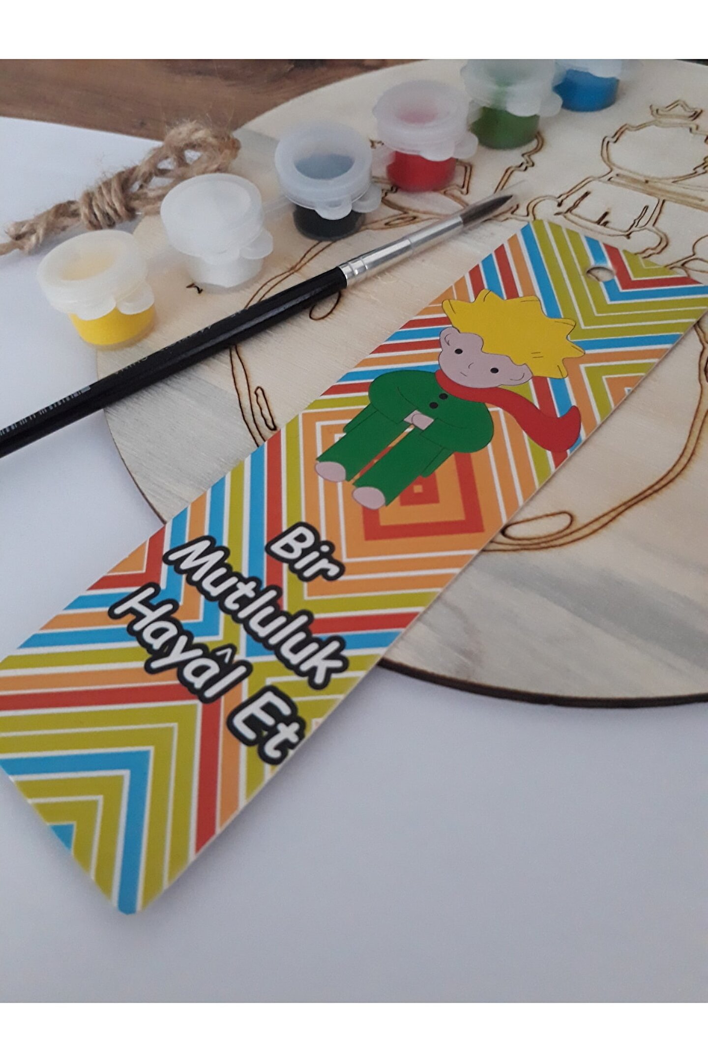 CANLI RENKLERİN:İnsanlar üzerindeki olumlu etkisiyle terapi hissi yaratır.Ahşabın doğallığını yaşam alanına taşır.Keyifli zaman geçirmeni sağlar,yaratıcığını ortaya çıkarır. ; SEVGİ DOLUBİR HEDİYE:Kendine,ailene ve arkadaşlarına verebileceğin özel ve farklı bir hediyedir. ; YAŞAM ALANINI ÖZELLEŞTİR:Tercih edeceğin desendeki ahşap boyama kitisanatın ve sana özel olanı özelleştirmenin,ruhunu yansıtmanın kapısını aralar. ; ÇOCUKLAR İÇİN EĞLENCELİ:Çocuğunuzun yaratıcılığını geliştirmek ve birlikte eğlenceli vakit geçirebilmek için tercih edebileceğiniz bir üründür. ; PAKET İÇERİĞİ:Özel olarak tasarlanmış 4-6 mm kalınlığında ve 20 cm çapında ahşap tuval,6 farklı renkte akrilik boya paleti hasır asma ipi 1 adet standart boyama fırçası 1 adet küçükprens kitap ayracı 1 adet sipariş ismine özel kaligrafi sanatıyla yazılmış fon kartonu gönderilir ; UYGULAMA ŞEKLİ:Fırçalar nemli olursa boya daha güzel yayılacaktır.Boyamaya içten başlayıp dışa doğru devam edersen boyanın dışardan içeriye bulaşmasını engellemiş olursun. ; UYARILAR:İçeriğindeki akrilik boyalar sağlığa zararlı değildir.Cilde bulaşması durumunda su ile çıkarılabilir.Boyaların göz ve ağız ile temasından kaçınınız.Ahşap detay çubuğu sivri uçludur ve çocukların kullanmaması tavsiye edilir.Çocukların bir yetişkin gözetiminde boyama yapması gerekmektedir. ; MEMNUNİYET GARANTİSİ:Mutluluğunu düşünerek tasarladığımız ürünlerde memnuniyetine önem veriyoruz.MEMNUNİYET GARANTİSİ ile birlikte ÜRÜN GARANTİSİNİ de sunuyoruz.Her türlü soru ve görüşlerin bizler için çok değerli.Bizimle Trendyol üzerinden iletişime geçmen yeterli olacaktır. ; Tüm Boyama Setlerini AYNI ÖZEN VE DİKKATLE HAZIRLAYIP hızlı şekilde kargo firmasına teslim ediyoruz. ; Yorum ve puanlaması olmayan boyama setlerini de GÖNÜL RAHATLIĞIYLA tercih edebilirsin. ;