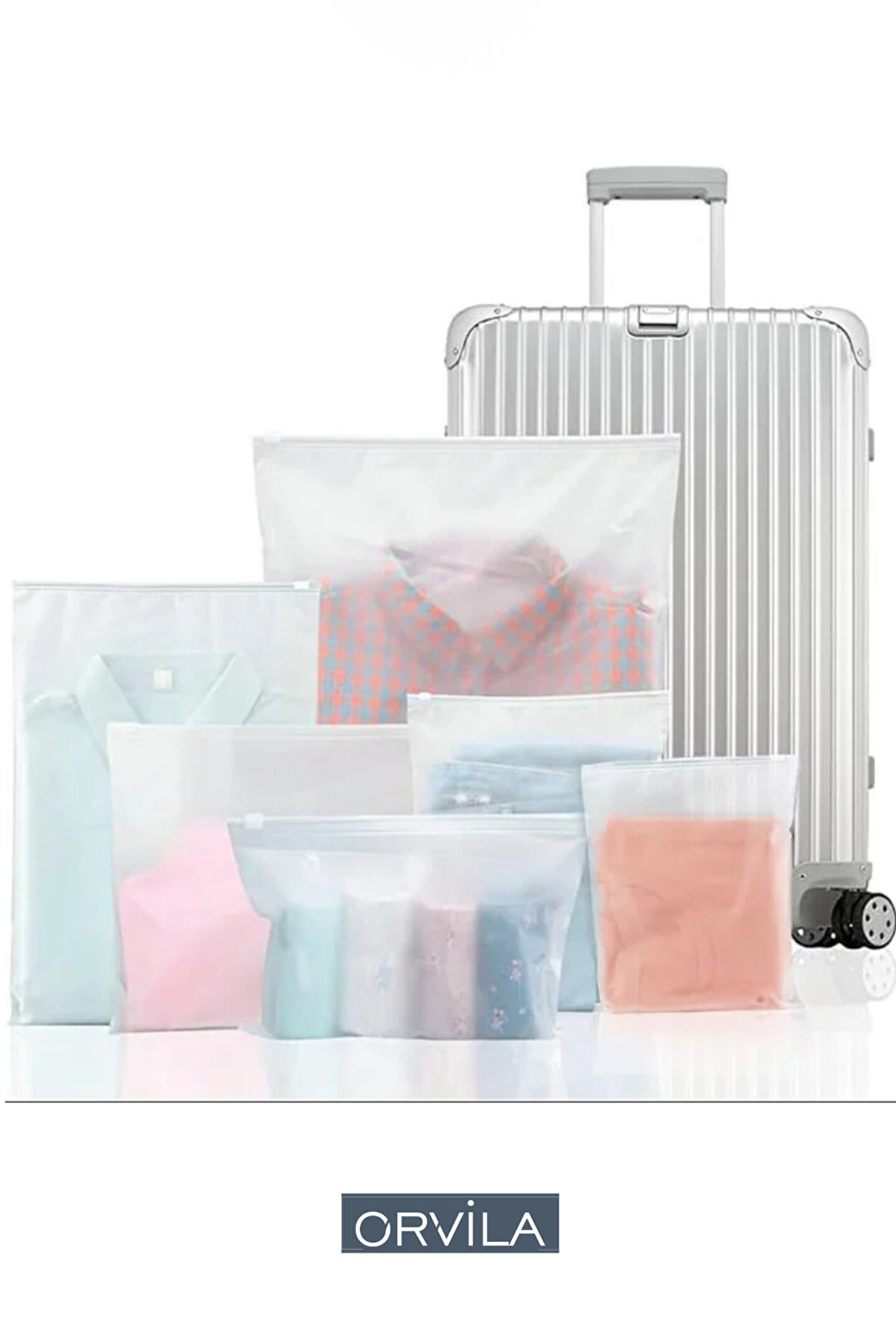 Kıyafet, aksesuar, belge veya kozmetik eşyalarınızı düzenli bir şekilde saklamanızı sağlayan buzlu görünümlü fermuarlı poşet torba; hem evde hem de seyahatlerde pratik bir kullanım sunar; 58x50 cm ölçüsüyle bavul içi düzenleyici, valiz içi torba, çanta içi düzenleyici veya kozmetik poşeti olarak kullanıma uygundur; şeffaf-buzlu dokusu sayesinde içindekiler kolayca görülebilir; tekrar kullanılabilir ve dayanıklı yapısı sayesinde uzun ömürlü kullanım sağlar; suya, toza ve kirlenmeye karşı koruma özelliği ile eşyalarınızı güvenle muhafaza eder; kompakt boyutu sayesinde seyahatlerde az yer kaplar; valiz düzenini korur ve eşyalarınızın karışmasını önler; giyim ürünlerinden elektronik aksesuarlara kadar birçok farklı eşyayı düzenli bir şekilde saklamanıza yardımcı olur; estetik görünümüyle ev içi kullanımda da şık bir saklama çözümüdür.;
