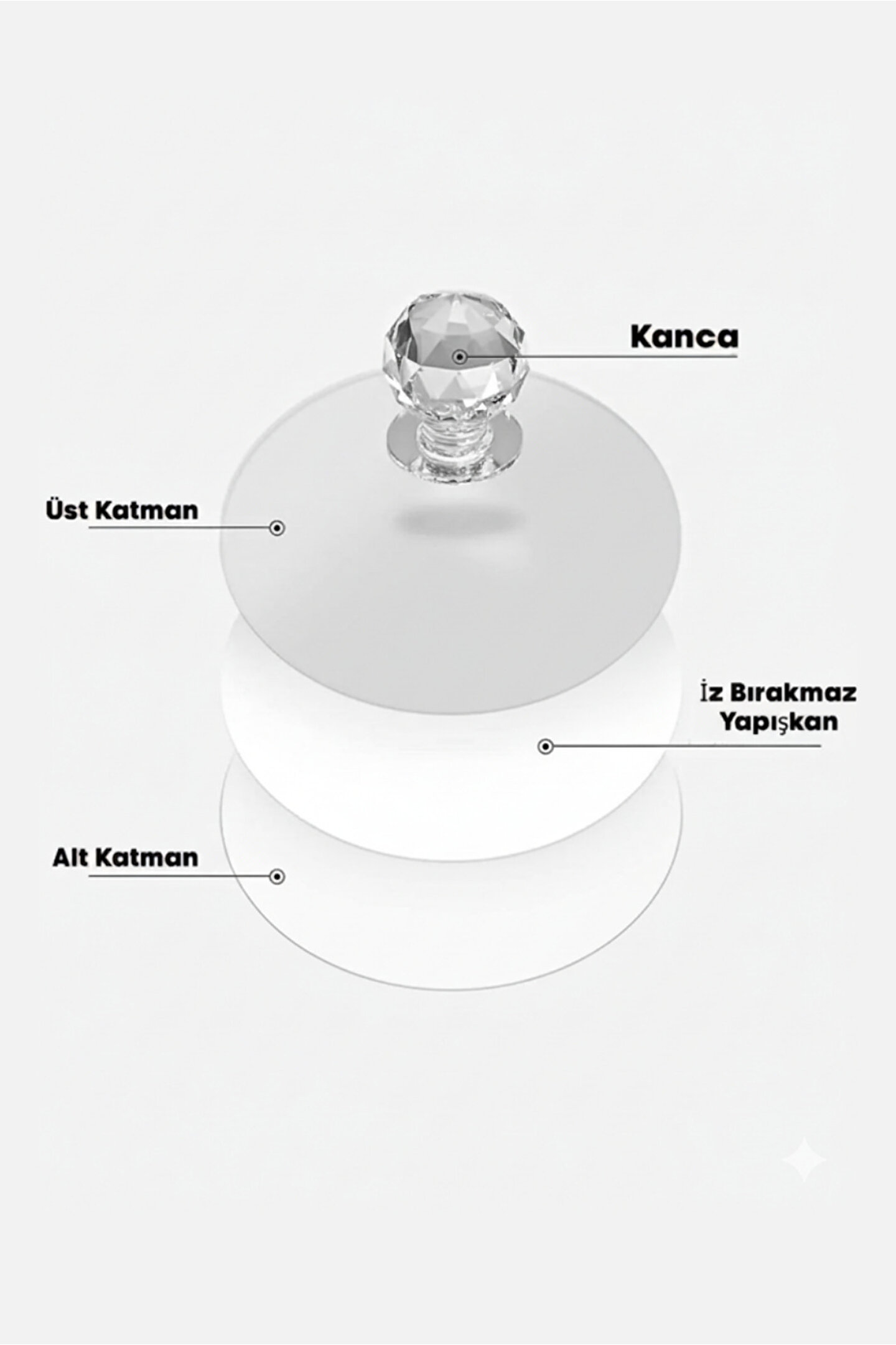 Yapışkanlı tutma kulpu; güçlü vakumlu yapışma yüzeyi sayesinde dolap kapağı, çekmece, klozet kapağı, buzdolabı rafı gibi tüm düz yüzeylerde pratik kullanım sağlar; kristal görünümlü şeffaf tutma başlığı ile modern ve estetik bir görünüm sunar; kurulum gerektirmez, delme–vidalama ihtiyacını ortadan kaldırır; su geçirmez ve neme dayanıklı yapısı sayesinde banyo, mutfak ve balkon gibi ıslak alanlarda güvenle kullanılabilir; düşmeyen sağlam tutuşu ile kapağı kolayca açmanızı sağlar; plastik ve cam yüzeylerde iz bırakmaz, yüzeyi çizmeyen tasarım sunar; çocuklar ve yaşlılar için kullanımı kolaydır; taşınabilir yapısı sayesinde istediğiniz yere saniyeler içinde uygulanır; hijyenik ve uzun ömürlü malzemeden üretilmiştir; ev, ofis, karavan ve öğrenci yurdu gibi her yaşam alanında kullanım için idealdir; 10’lu ekonomik set içeriğiyle çoklu kullanım imkânı sağlar; gardırop, mutfak dolabı, banyo dolabı, yatak odası çekmeceleri ve klozet kapağı gibi alanlarda yüksek pratiklik sunar.; 10 adet Ölçüsü Çap 5,5 cm Yükseklik 2,5 cm dir.;