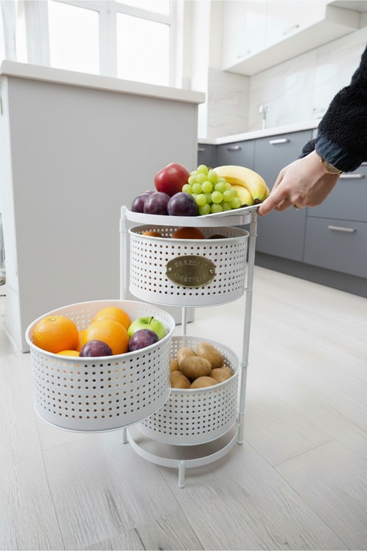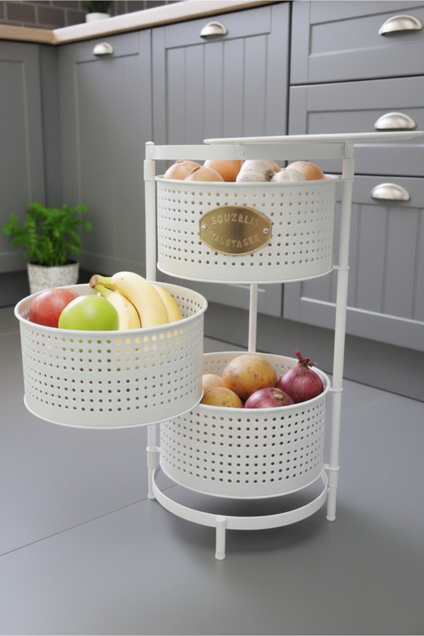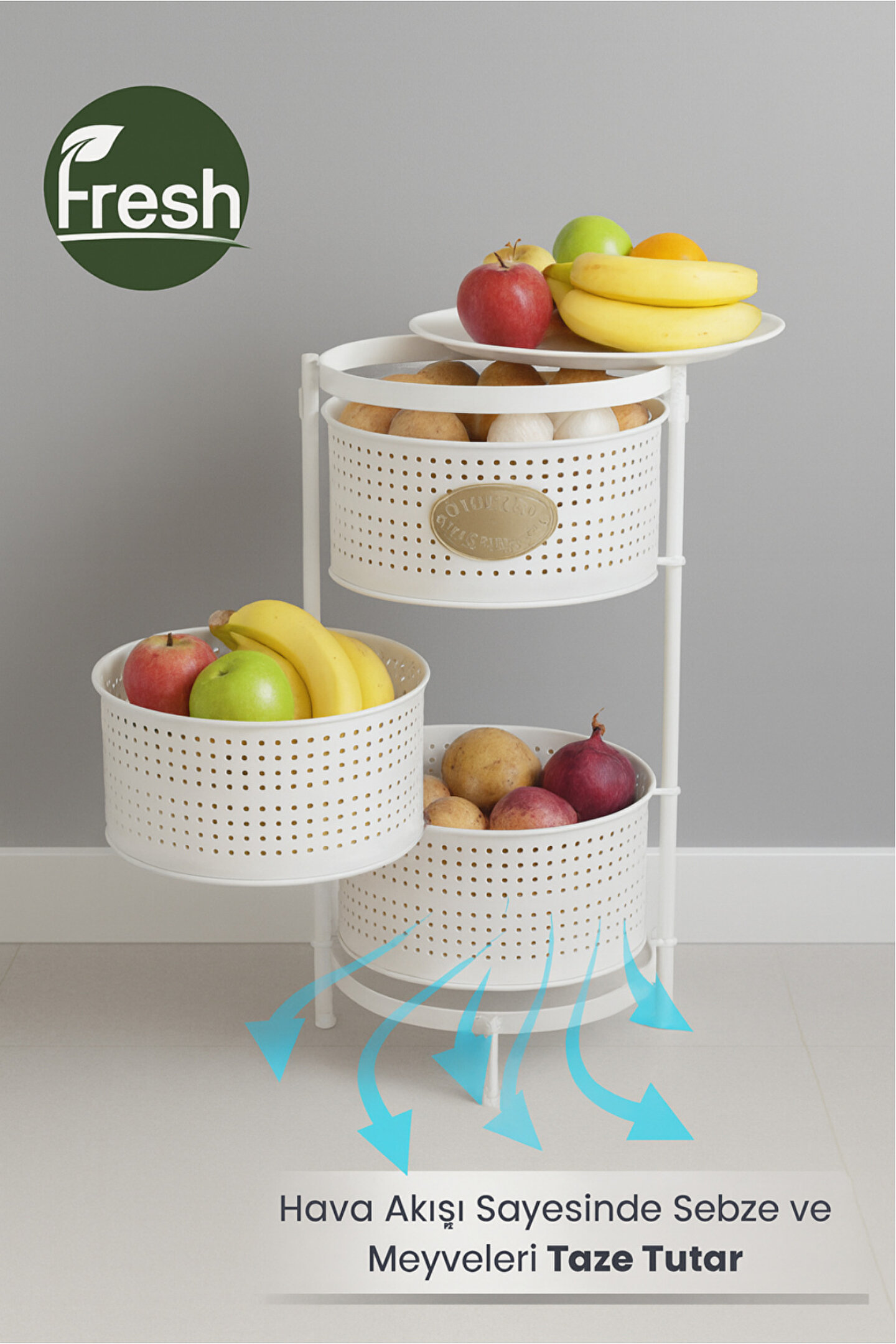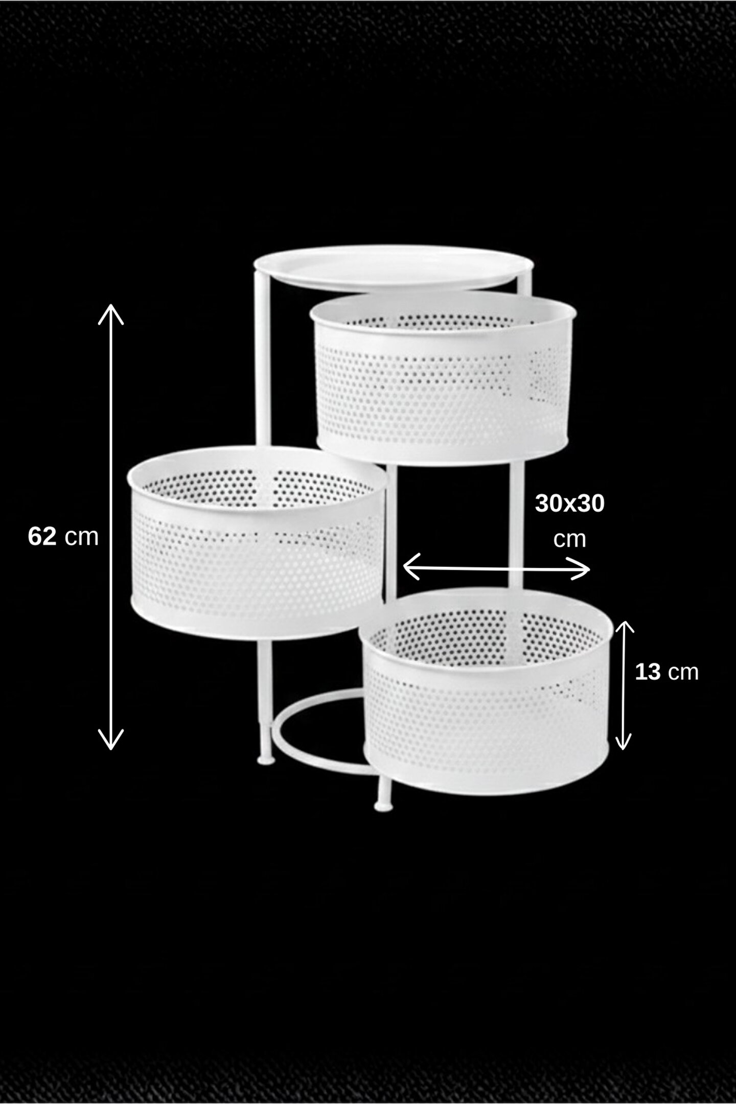 Ölçüler: Sepetler : 30x30 Cm; Sepet Yüksekliği : 13 cm ; Toplam Yükseklik : Yükseklik : 62 cm; Mutfak tezgâhında ya da evinizin başka alanlarında ekstra depolama alanına ihtiyaç duyanlar.; Sebze ve meyvelerini düzenli şekilde saklamak isteyenler.; Evleri küçük olan, alanı verimli kullanmak isteyenler.; Kolayca hareket ettirip gerektiğinde sabitlemek isteyen kullanıcılar.;