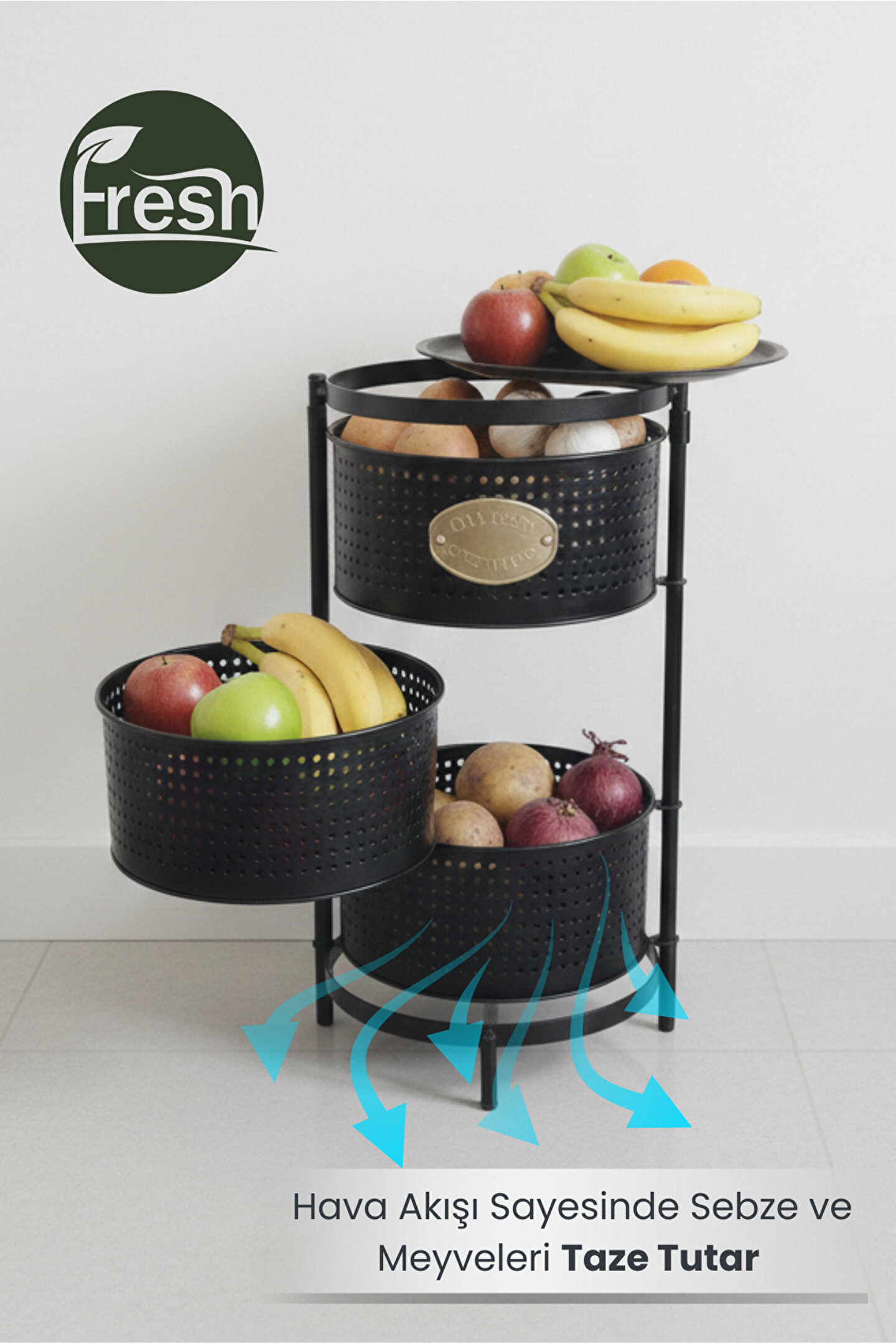 Ölçüler: Sepetler : 30x30 Cm; Sepet Yüksekliği : 13 cm ; Toplam Yükseklik : Yükseklik : 62 cm; Mutfak tezgâhında ya da evinizin başka alanlarında ekstra depolama alanına ihtiyaç duyanlar.; Sebze ve meyvelerini düzenli şekilde saklamak isteyenler.; Evleri küçük olan, alanı verimli kullanmak isteyenler.; Kolayca hareket ettirip gerektiğinde sabitlemek isteyen kullanıcılar.;