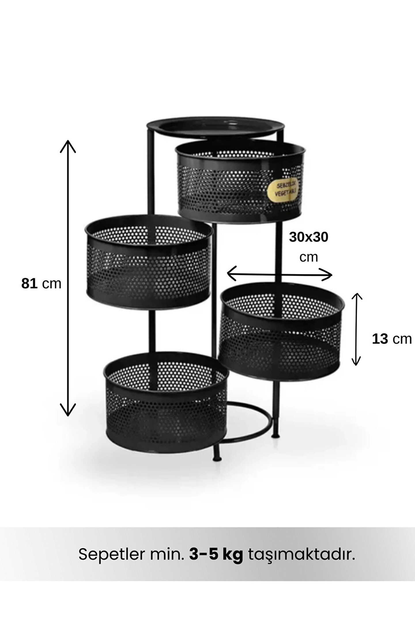 Ölçüler: Sepetler : 30x30 Cm; Sepet Yüksekliği : 13 cm ; Toplam Yükseklik : Yükseklik : 81 cm; Her bir katı min 3 kg taşımaktadır.; Mutfak tezgâhında ya da evinizin başka alanlarında ekstra depolama alanına ihtiyaç duyanlar.; Sebze ve meyvelerini düzenli şekilde saklamak isteyenler.; Evleri küçük olan, alanı verimli kullanmak isteyenler.; Kolayca hareket ettirip gerektiğinde sabitlemek isteyen kullanıcılar.;