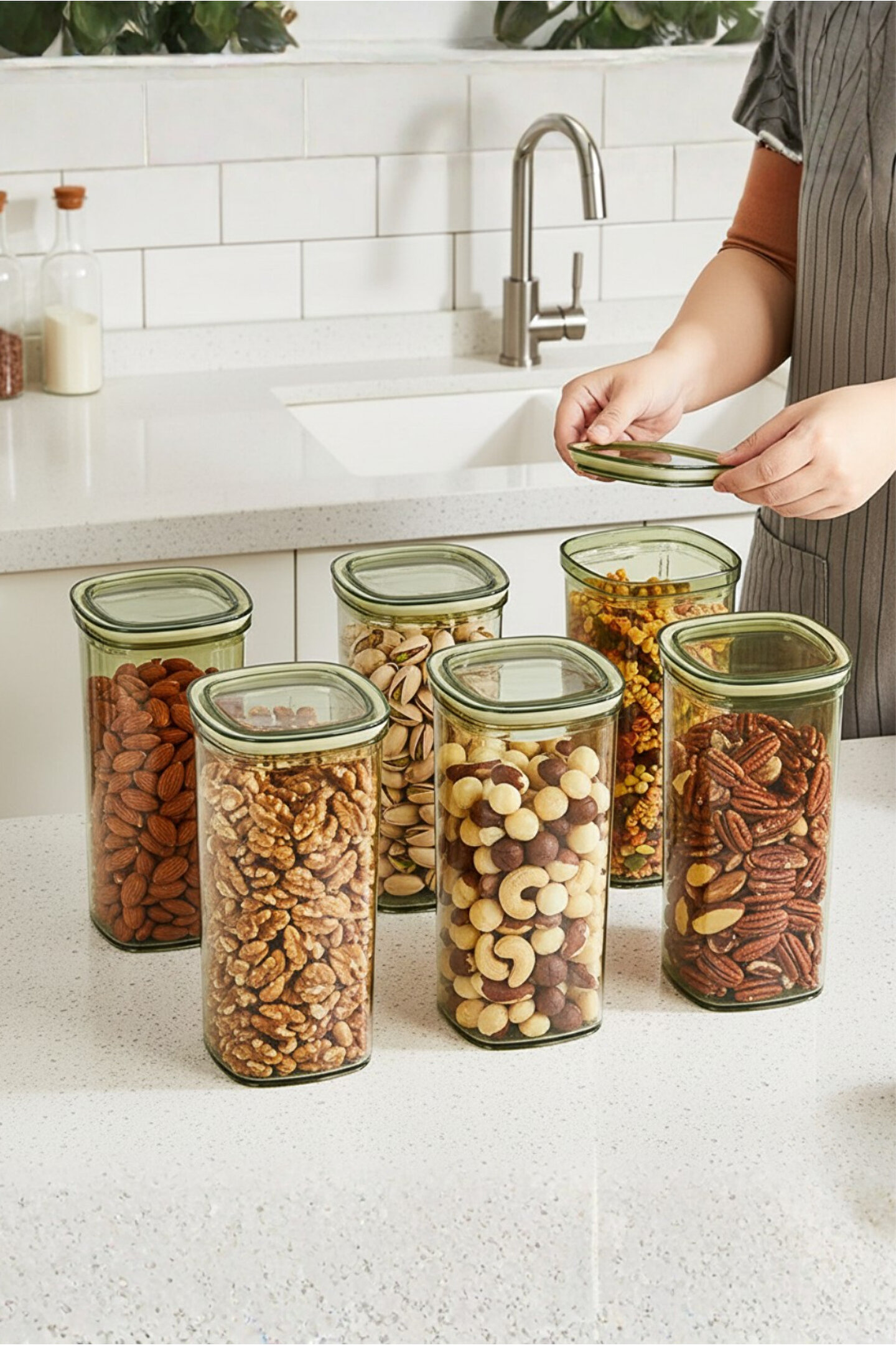 Saklama kapları; hava geçirmez ve sızdırmaz kapak sistemi sayesinde kuruyemiş, bakliyat, kahvaltılık ve atıştırmalıkları uzun süre taze tutar; hijyenik cam yüzeyi sayesinde gıdalarla tamamen güvenli temas sağlar ve koku yapmaz; modern kare-oval formuyla mutfak tezgâhında şık bir görüntü oluşturur; düzenli depolama için dar alanlara dahi rahatlıkla sığan ergonomik tasarıma sahiptir; saydam cam gövde içindeki ürünleri kolayca görmenizi sağlayarak kullanım kolaylığı sunar; kapak kısmı sağlam oturan özel contalı yapısı ile nemi engeller ve ürünlerin raf ömrünü uzatır; ceviz, fındık, badem, kaju, makarna, bakliyat, kahve çekirdeği, kuru meyve ve granola gibi tüm kuru gıdaların saklanmasına uygundur; ofis, mutfak, kiler ve restoranlarda düzen sağlamak için ideal depolama çözümüdür; ısıya, çizilmeye ve darbelere karşı dayanıklı cam yüzeyi uzun ömürlü kullanım sunar; minimal ve modern tasarımı ile her mutfak dekorasyonuna uyum sağlar; tezgâh üstü kullanımda estetik bir görünüm oluştururken dolap içlerinde de maksimum düzen sağlar; günlük kullanım için pratik ve kolay temizlenebilir yapısı ile kullanıcı dostudur; sağlıklı yaşamı destekleyen cam malzemesi plastik kokusu olmadan doğal saklama imkânı sunar; evinizde hem estetik hem fonksiyonel bir düzen yaratmak isteyenler için ideal bir seçimdir.; Ölçüsü 23,5x11,5 cm dir.; Elde yıkayınız bulaşık makinasına uygun değildir.;
