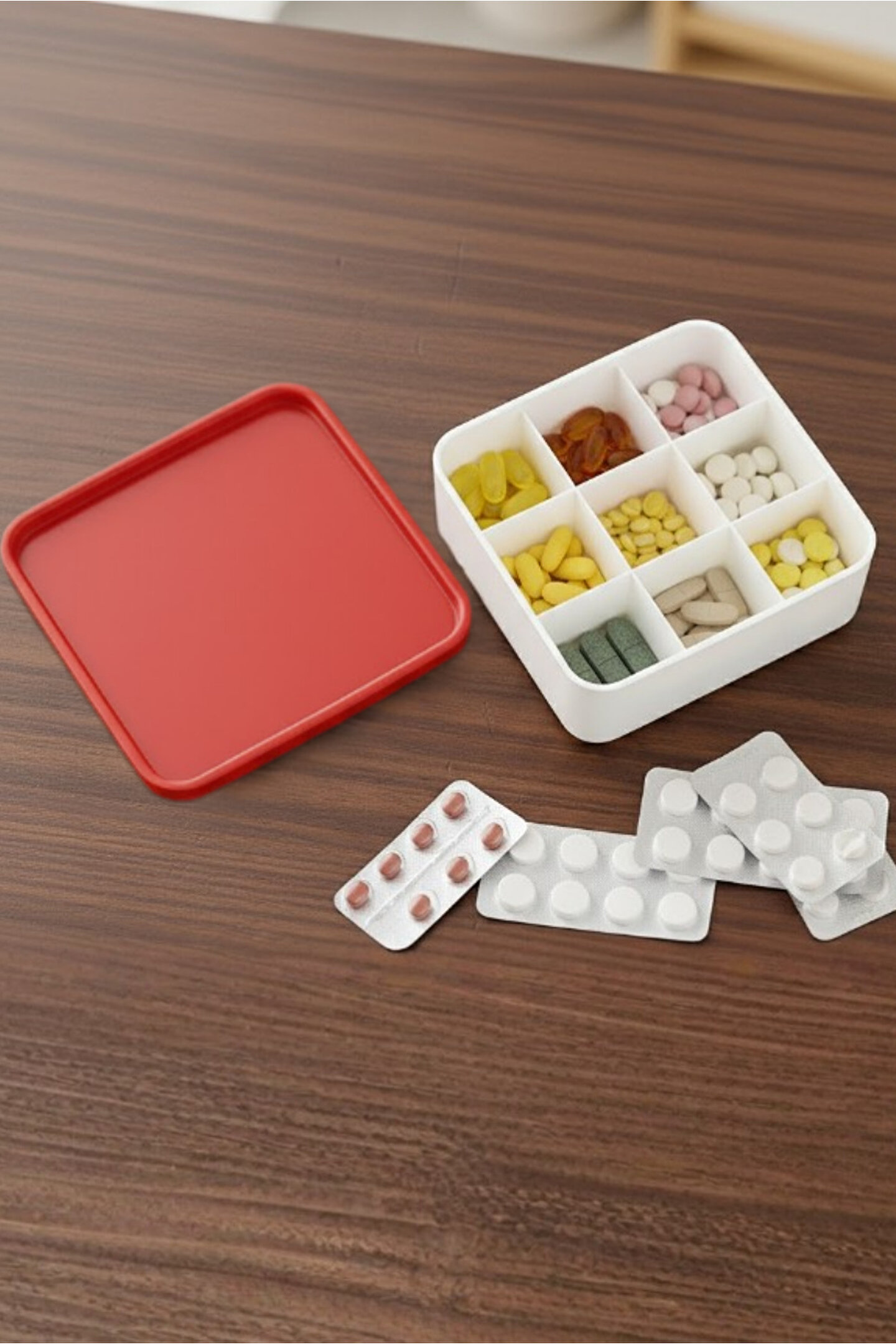 9 Gözlü İlaç ve Vitamin Düzenleyici Kutu; günlük, haftalık ve aylık hap kullanımını pratik şekilde organize etmek isteyenler için tasarlanmış ergonomik bir saklama çözümüdür; 9 bölmeli iç yapısı sayesinde vitamin, takviye edici gıdalar, reçeteli ilaçlar, ağrı kesiciler ve kapsülleri karışmadan güvenle depolamanıza yardımcı olur; kapağı sıkı kapanan yapısı ile çanta, valiz, ofis çekmecesi veya mutfak dolabında dökülme ve karışma riskini ortadan kaldırır; kompakt formu sayesinde az yer kaplar ve günlük kullanım için maksimum kolaylık sağlar; dayanıklı, sağlığa zararsız ve BPA içermeyen malzemeden üretilmiştir; evde yaşlı bireyler, düzenli ilaç kullananlar, sporcular, anneler ve yoğun iş temposunda düzen arayan herkes için ideal bir saklama kutusudur; şeffaf bölme tasarımı ile içindekileri tek bakışta görme imkânı sunar; çocuk kilidi özellikli kapak yapısı sayesinde güvenli bir kullanım sağlar; her vitamin ve hap için ayrı göz sunarak karışıklığı, doz atlamayı ve yanlış ilaç kullanımını önler; modern ve minimalist tasarımıyla hem şık hem de fonksiyonel bir düzenleme ürünü olarak yaşam alanlarınıza uyum sağlar; Ölçüsü 13,5x13,5 cm dir;