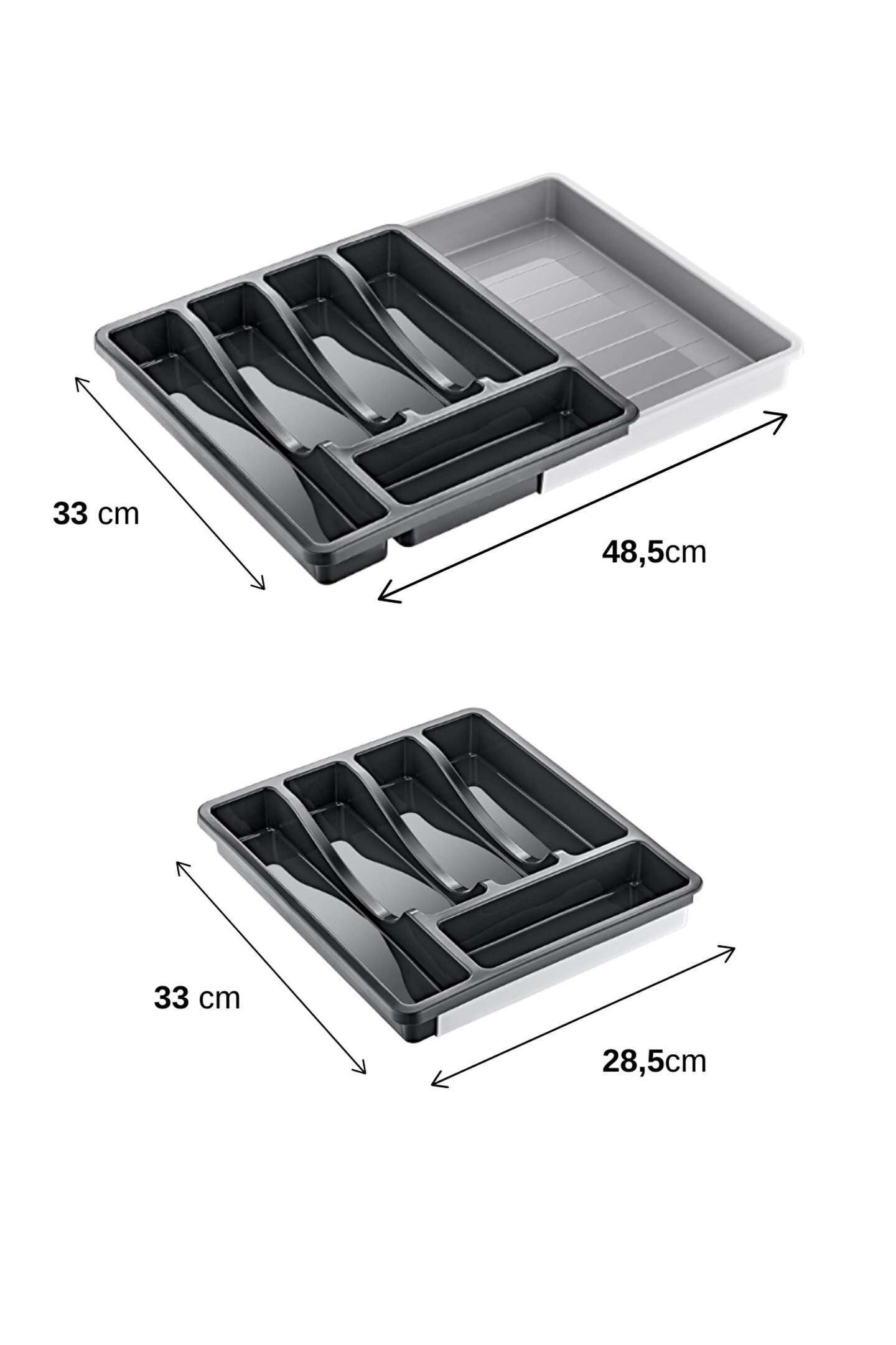 Ayarlanabilir kaşıklık düzenleyici; mutfak çekmecelerini düzenli ve kullanım açısından pratik hale getirmek için tasarlanmış çok bölmeli bir düzenleme aparatıdır; genişletilebilir yapısı sayesinde farklı çekmece ölçülerine uyum sağlar; çatal, kaşık, bıçak, servis malzemeleri ve mutfak gereçlerini kategorilere ayırarak hızlı erişim sağlar; dayanıklı ve uzun ömürlü plastik yapısı ile gündelik kullanımda deformasyon oluşmasını engeller; kaymaz yüzeyi sayesinde çekmece içinde sabit durur ve kayma yapmaz; hijyenik materyalden üretilmiş olup kolay temizlenebilir, elde veya nemli bezle hızlıca silinebilir; modern ve minimal tasarımıyla mutfak dekorasyonuna uyum sağlar; geniş iç hacmi sayesinde kalabalık mutfak gereçlerini bile düzenli bir şekilde yerleştirmenize imkân tanır; tekli, çoklu veya yan yana kullanım için idealdir; servis kaşığı, bıçak, çay kaşığı ve yemek çatalı gibi farklı boyuttaki ürünler için özel bölmeleri bulunur; mutfak çekmecelerinde düzen sağlar, dağınıklığı azaltır ve alan kullanımını verimli hale getirir; pratik kurulumu sayesinde çekmeceye yerleştirmeniz yeterlidir, ek montaj gerektirmez; yüksek kalite malzemesi sayesinde uzun süre ilk günkü formunu korur; ev mutfakları, ofis mutfakları ve karavanlar için mükemmel bir düzenleme çözümüdür.; Kapalı hali ölçüsü 32,5x28,5 cm açık hali 48,5x32,5 cm