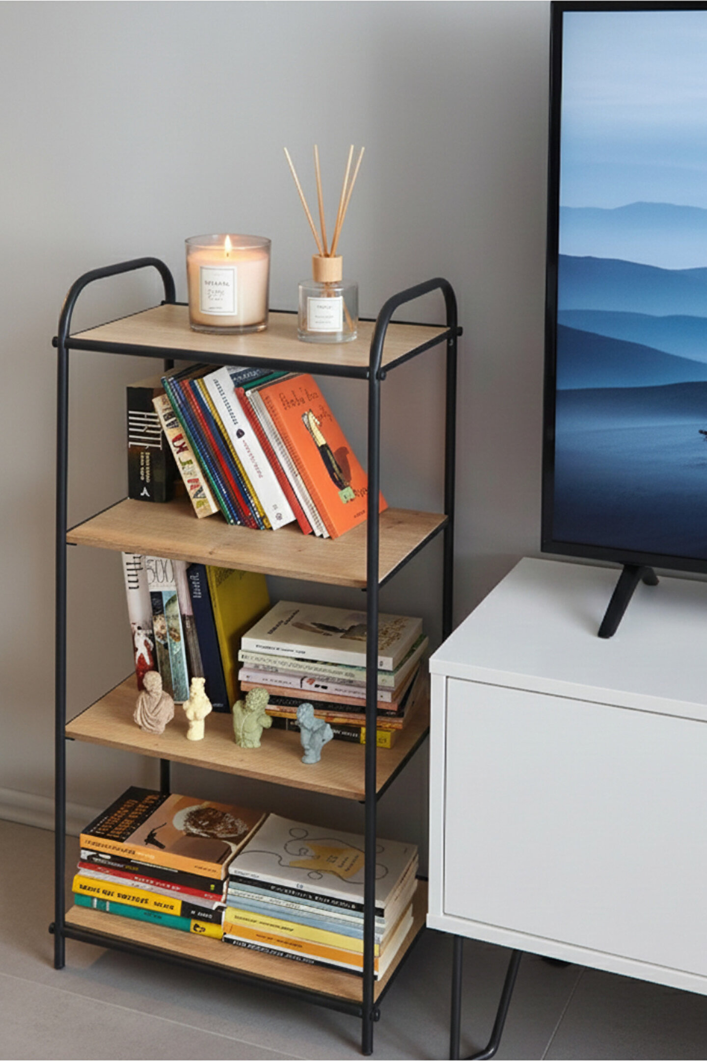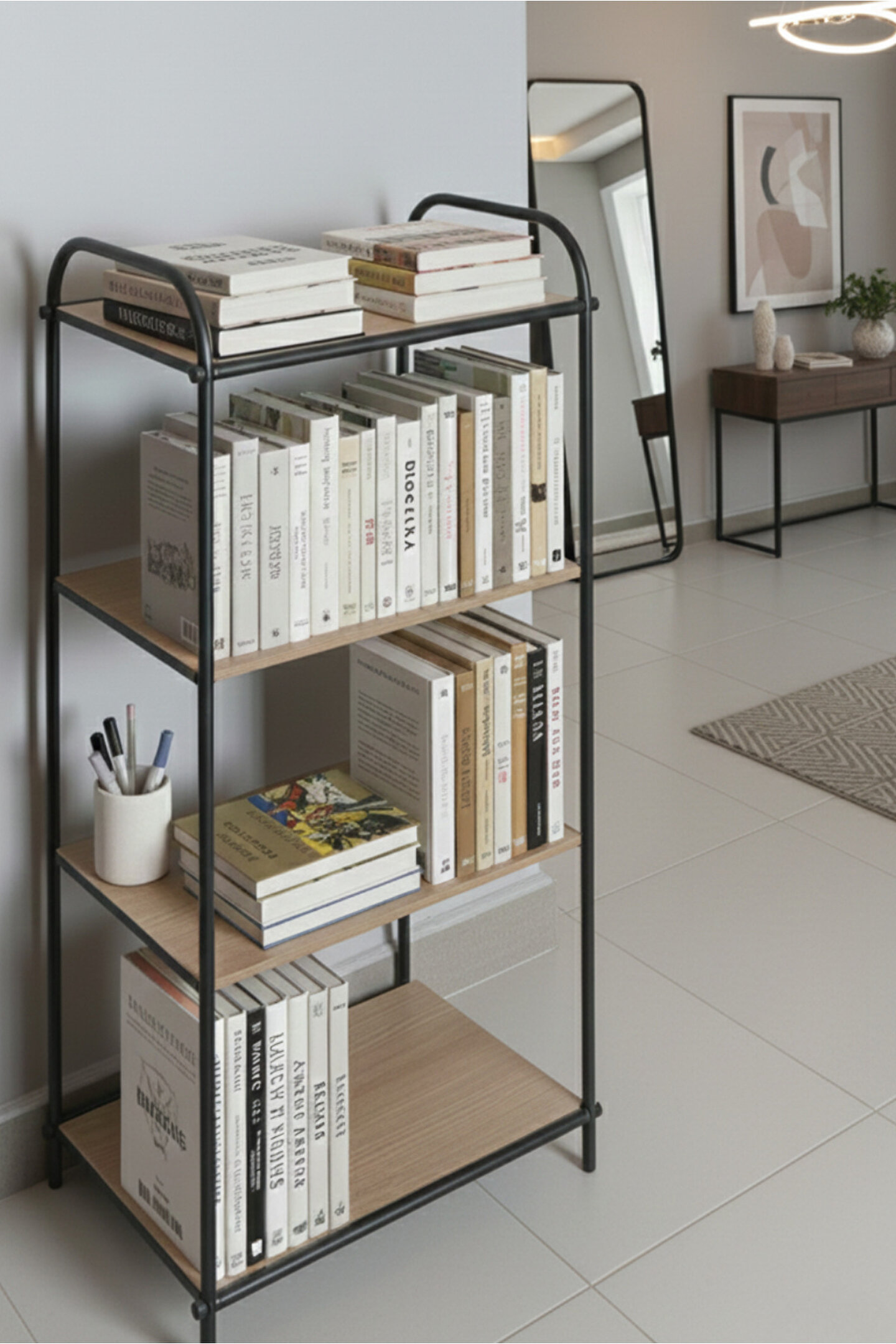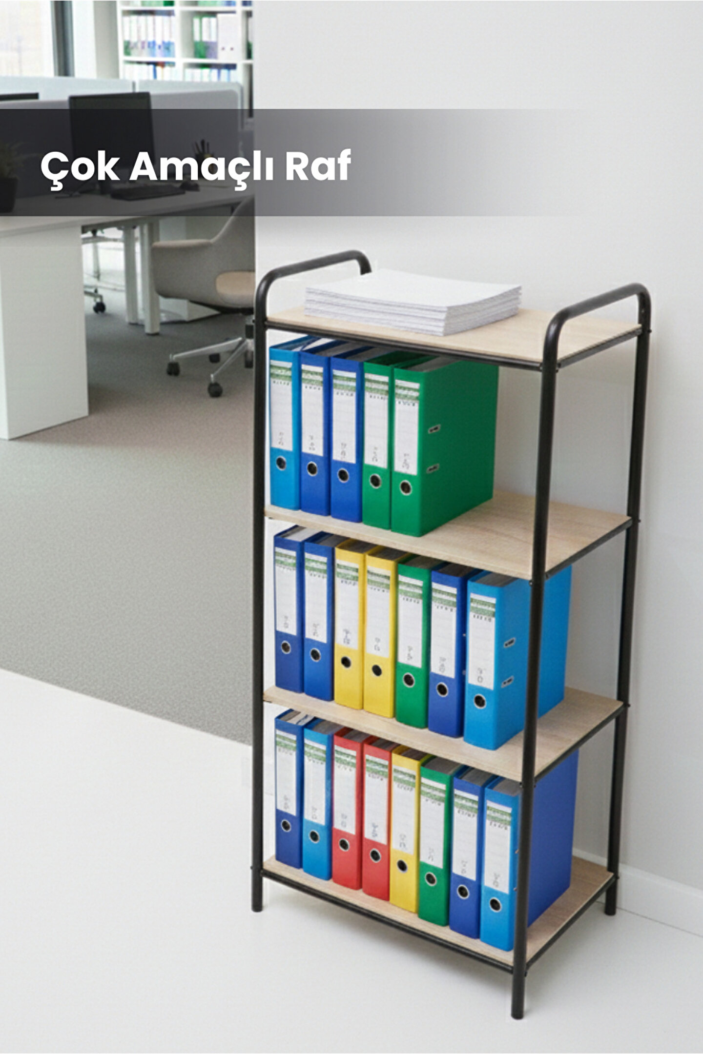 Modern ve sade tasarımıyla ev ve ofis kullanımına uygun çok amaçlı raf; dayanıklı siyah metal iskeleti sayesinde sağlam ve uzun ömürlü kullanım sunar; ahşap görünümlü raf yüzeyleriyle dekoratif ve profesyonel bir görünüm kazandırır; klasör, dosya, kitap, evrak ve ofis malzemeleri için geniş depolama alanı sağlar; çok katlı yapısı sayesinde dar alanlarda maksimum düzen ve alan tasarrufu sunar; duvara dayalı kullanım için idealdir ve yer kaplamaz; ofis, çalışma odası, ev ofisi, salon ve depolama alanlarında çok amaçlı olarak kullanılabilir; dengeli ayak yapısı sayesinde güvenli ve sağlam duruş sağlar; kolay montaj özelliğiyle pratik kurulum imkanı sunar; modern, minimalist ve endüstriyel dekorasyon stilleriyle uyum sağlar; düzenli, ferah ve profesyonel bir ortam oluşturmanıza yardımcı olur.; 85cmx42cmx28cm dir.;