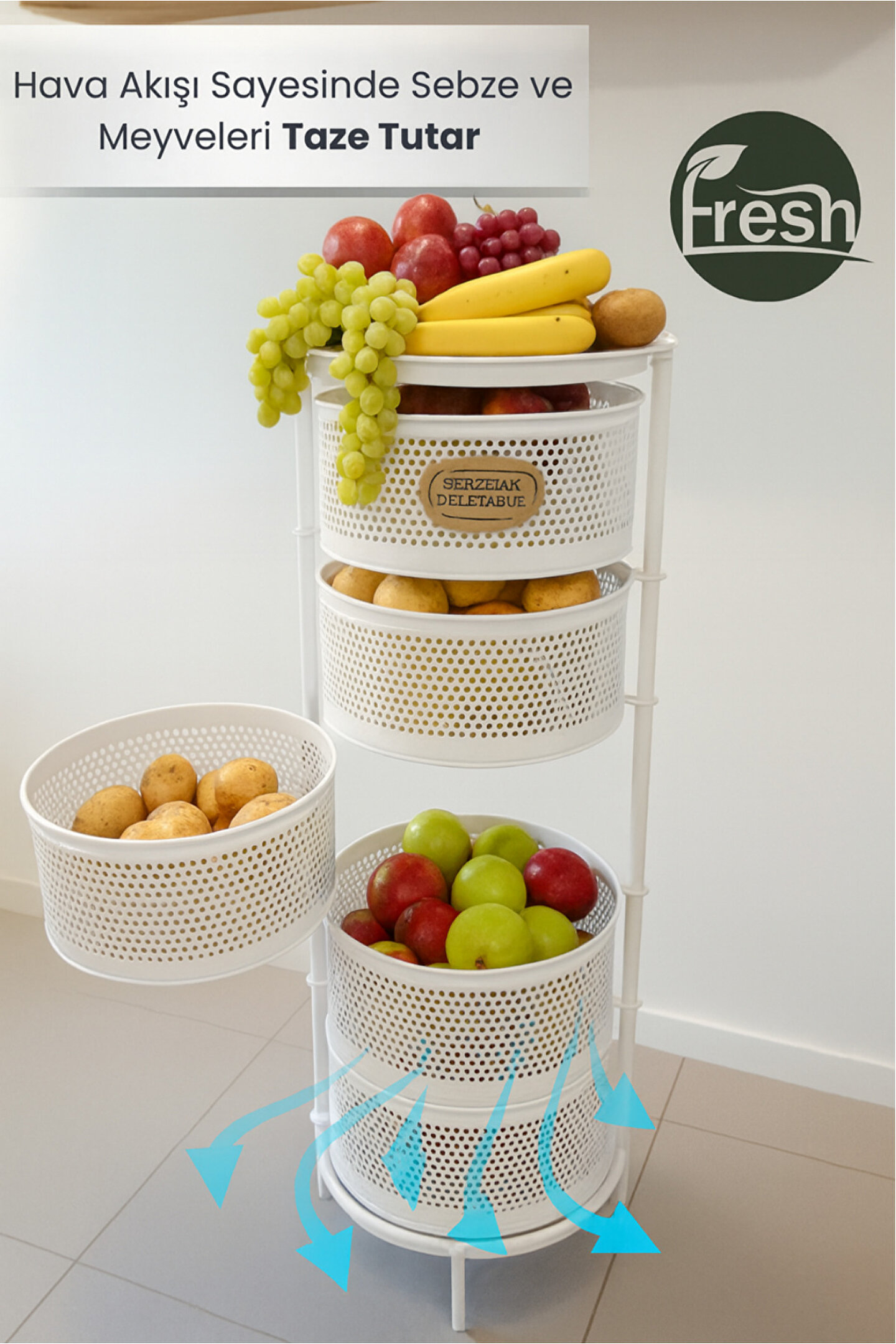 Ölçüler: Sepetler : 30x30 Cm; Sepet Yüksekliği : 13 cm ; Toplam Yükseklik : Yükseklik : 87 cm; Mutfak tezgâhında ya da evinizin başka alanlarında ekstra depolama alanına ihtiyaç duyanlar.; Sebze ve meyvelerini düzenli şekilde saklamak isteyenler.; Evleri küçük olan, alanı verimli kullanmak isteyenler.; Kolayca hareket ettirip gerektiğinde sabitlemek isteyen kullanıcılar.;