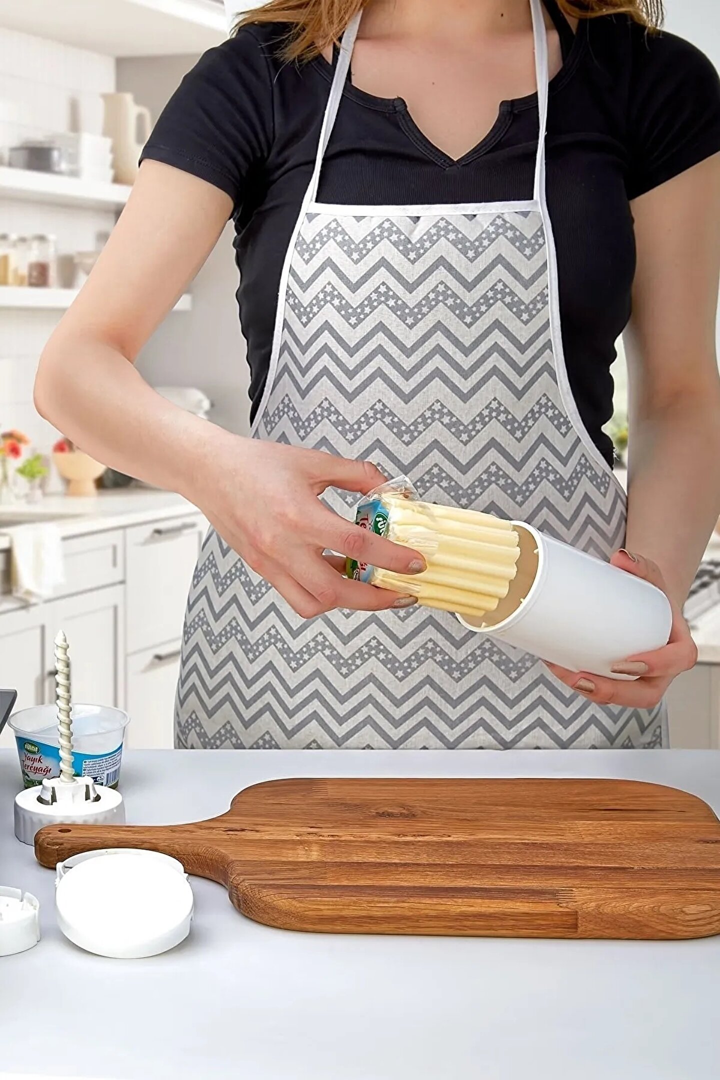 ButterCut Tereyağı Saklama, Ölçme, Yayma ve Kesme Aparatı. Tamamen yerli üretim olan tasarım patentli tereyağı aparatı ürünümüz ButterCut, tereyağınızı bozulmadan sağlıklı bir şekilde saklamanıza ve düzenli bir şekilde el değmeden kullanmanıza olanak sağlar. ; ButterCut,200, 250 ve 350 gr gibi kozalak tereyağları ile kova içinde satılmakta olan tüm tereyağları için doluma ve kullanıma uygundur. ; Kullanımı oldukça basittir ; paketinden çıkardığınız tereyağını hazneye yerleştirdikten sonra mekanizmayı kolayca döndürerek tereyağını hazneden istediğiniz ölçüde çıkarabilir ve istediğiniz gramajda kesebilirsiniz. ; ButterCut ürünümüz, yemeklerinizi lezzetli bir şekilde yapabilmeniz için tereyağını gramajlı olarak kullanmanıza olanak sağlayan basit ve anlaşılır şekilde dizayn edilmiştir. Kek, kurabiye gibi ölçü gerektiren tariflerinizde ürün üzerinde belirtilen gramaj ibarelerinden faydalanabilirsiniz. ; Ön kısımda bulunan paslanmaz çelik tel, tereyağınız ne kadar soğuk olursa olsun basit bir döndürme hareketi ile el değmeden istenilen ölçüde dilimler. ; Tereyağını tost, bazlama gibi pek çok yiyecekte pratikçe sürerek kullanmak, ButterCut tereyağı aparatı ile çok kolay ve zevkli hale gelecektir. ; ButterCut oldukça kolay bir şekilde sökülebilir kompakt yapıda üretilmiştir. Tüm parçalarını kullanımdan önce ve sonra bulaşık makinesinde güvenle yıkayabilirsiniz. ; ButterCut ile tereyağı yapısı bozulmadan buzdolabında kullanıma hazır şekilde saklanabilir. ; Gıda temasına uygundur. Yüksek kalite BPA içermeyen geri dönüştürülebilir ABS hammadde ile gıdaya uygun dayanıklı paslanmaz çelik telden üretilmiştir. ; Ürün çapı 7,2 cm, ürün uzunluğu 13 cm.dir. ;