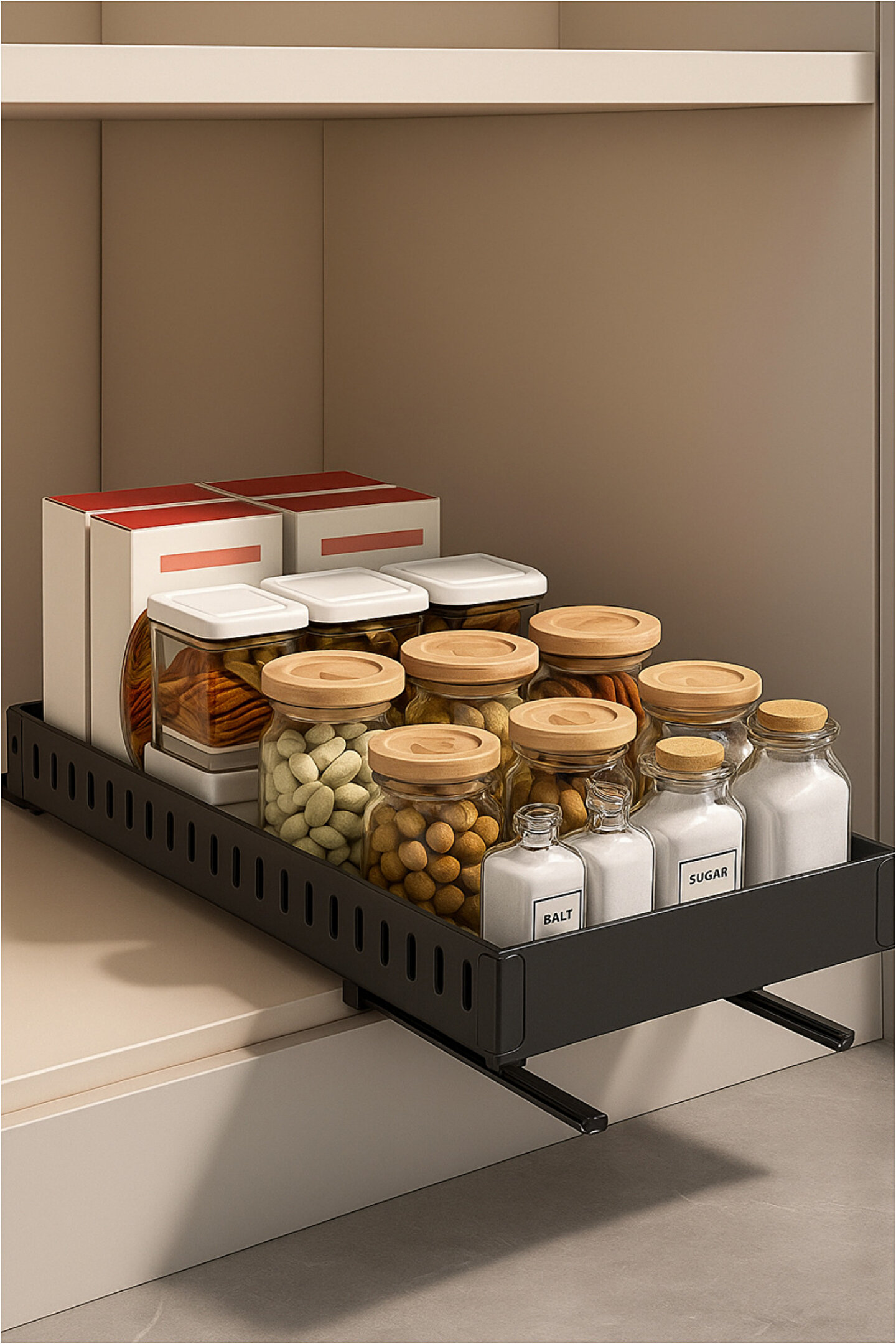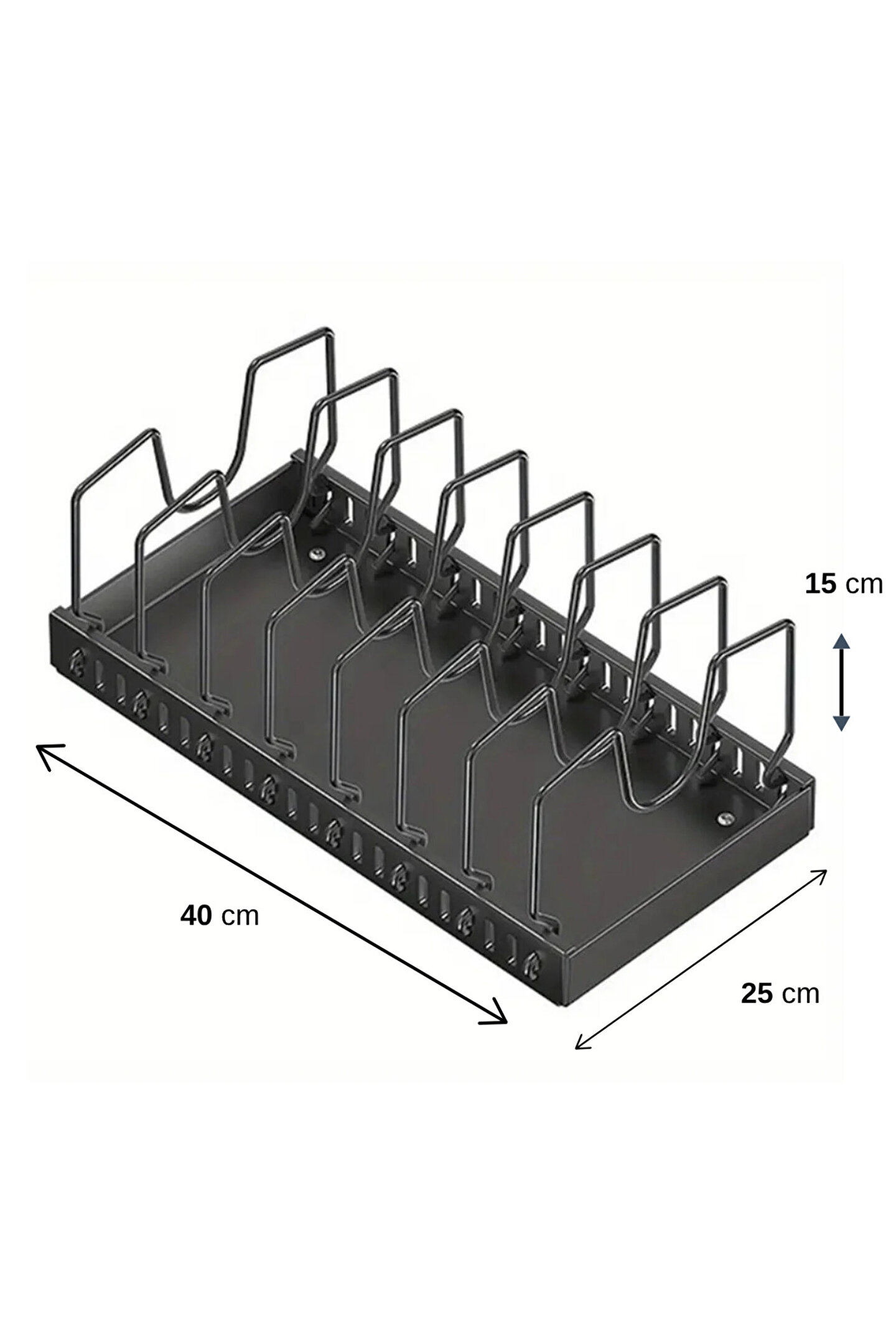 Mutfakta düzeni yeniden tanımlayın! 8 bölmeli raylı organizer, tencere kapakları, tavalar, baharatlıklar ve mutfak aksesuarlarını tek bir alanda düzenli şekilde saklamanızı sağlar; dayanıklı metal malzemesi sayesinde uzun ömürlü kullanım sunar; ölçüsü 40x25x15 cmdir.; raylı yapısı sayesinde kolay çekme ve yerleştirme imkânı verir; dolap içi, tezgâh altı veya çekmece içi kullanıma uygundur; modern tasarımıyla mutfağınıza hem şıklık hem de işlevsellik kazandırır.;