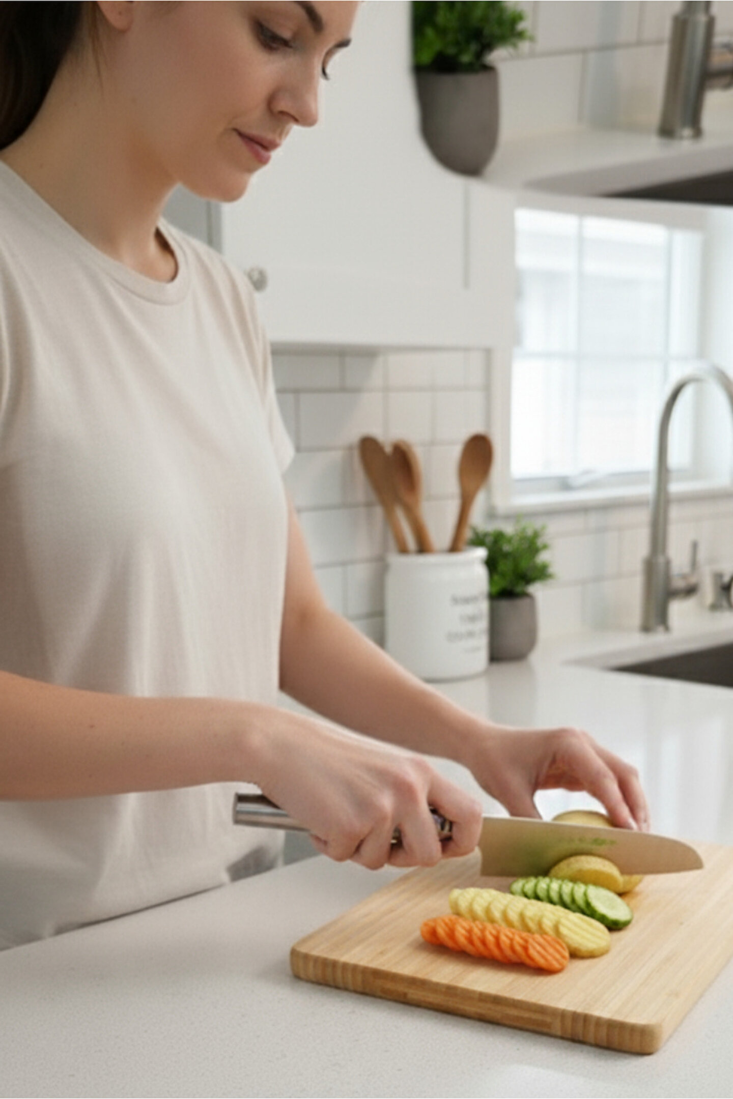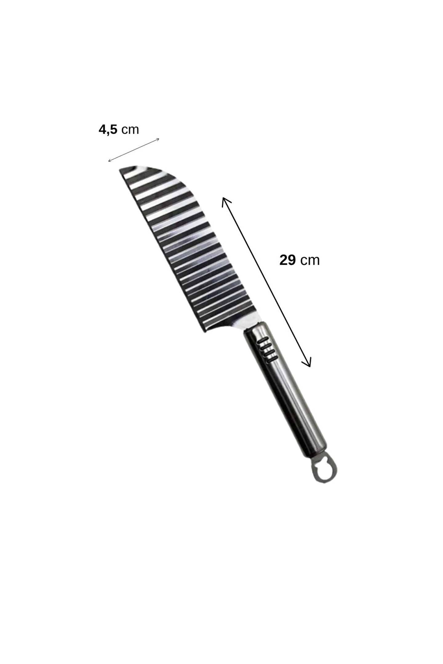 Dalgalı yüzeyli özel kesim tasarımı sayesinde patates, havuç, salatalık, kabak ve birçok sebzeyi profesyonel şef görüntüsünde şekilli dilimlemenizi sağlar; paslanmaz çelikten üretilmiş keskin bıçak yapısı uzun ömürlü, dayanıklı ve yüksek performanslı kullanım sunar; ergonomik, kaymaz ve el yormayan sapı sayesinde kesim sırasında maksimum kontrol ve güvenlik sağlar; sebzeleri eşit, dekoratif ve iştah açıcı formda keserek salata, garnitür, kızartma ve sunum tabaklarına estetik bir görünüm kazandırır; çocuklar için daha eğlenceli tabaklar hazırlamaya yardımcı olur; mutfakta hız ve pratiklik sağlayan kompakt yapısı çekmecede, askıda veya düzenleyicide minimum yer kaplar; paslanma ve deformasyona karşı dirençli gövde yapısı sayesinde uzun yıllar ilk günkü performansını korur; kolayca temizlenebilen yüzeyi elde yıkamaya uygundur ve bakımı zahmet gerektirmez; ev mutfakları, profesyonel restoranlar, şef sunumları ve günlük yemek hazırlıkları için ideal bir yardımcıdır; sebzeleri şekilli, dalgalı ve dekoratif biçimde kesmek isteyen herkes için mükemmel bir mutfak ekipmanıdır.; Ölçüsü 29x4,5 cm