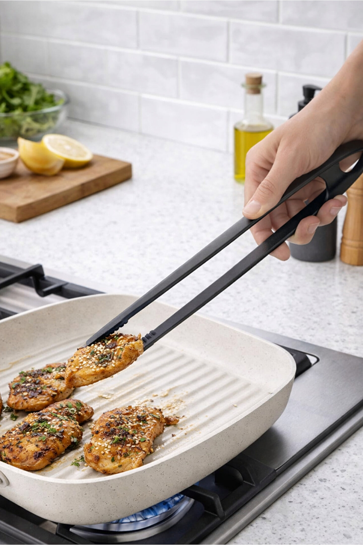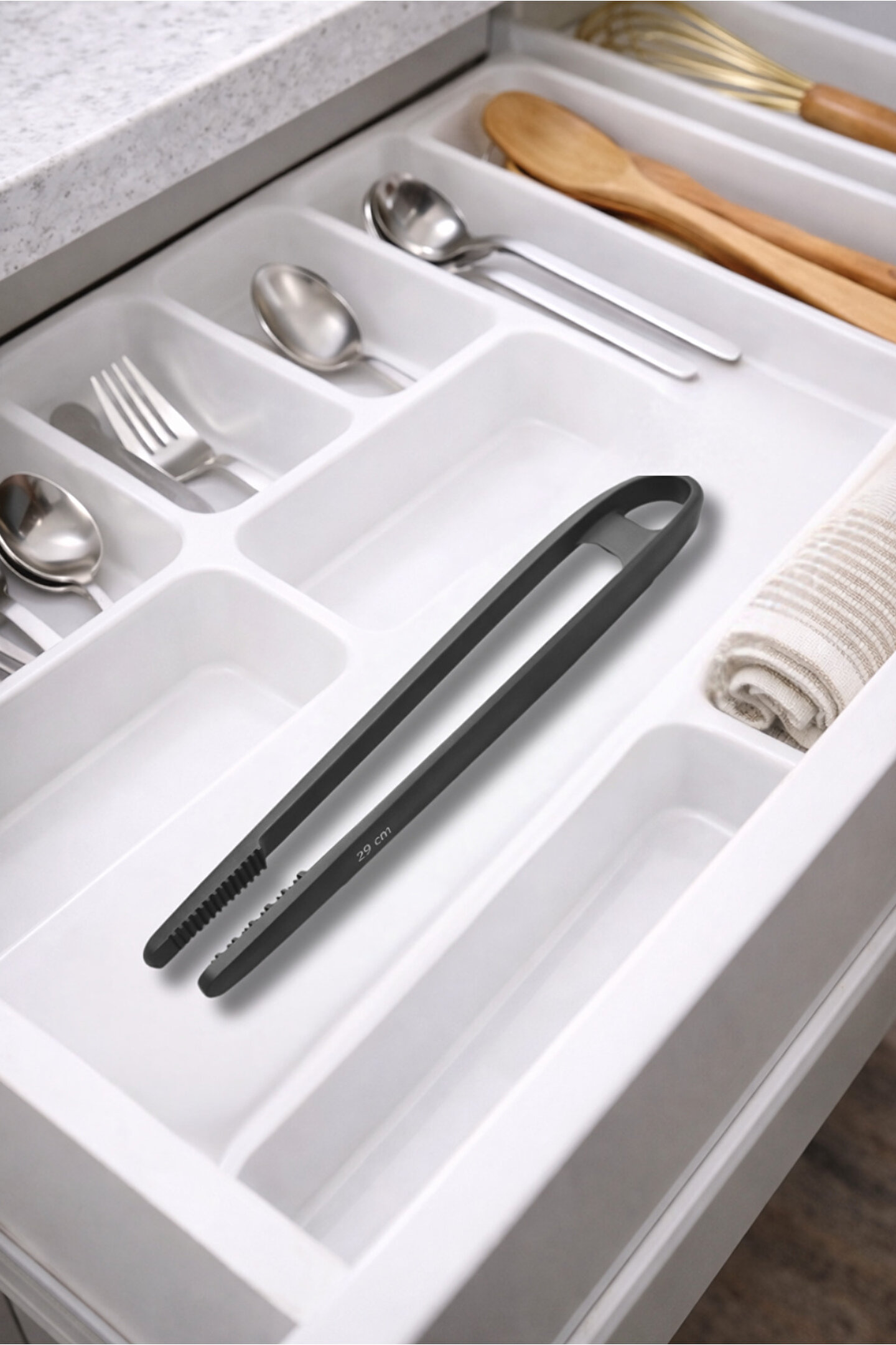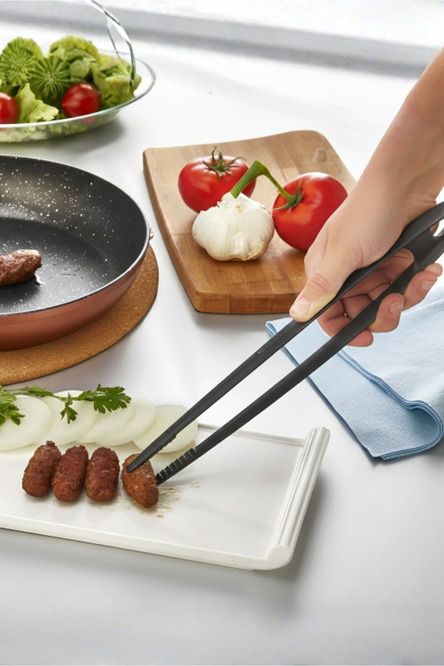 Şef cımbızı; 29 cm uzunluk; mutfak masası ve tezgâh kullanımına uygun profesyonel tasarım; köfte, et, tavuk, balık ve sebze tutmak için ideal yapı; yiyecekleri ezmeden ve dağılmadan kavramaya yardımcı uç formu; ısıya dayanıklı sağlam malzeme; ergonomik ve kaymaz sap tasarımı ile rahat tutuş; hafif ve dengeli yapı sayesinde kontrollü kullanım; yapışmaz tava ve tabaklarda güvenle kullanılabilir; pişirme, servis ve sunum aşamalarında çok amaçlı kullanım; modern siyah renk ile şık ve sade görünüm; kolay temizlenir, elde yıkamaya uygundur; ev tipi ve profesyonel mutfaklar için uygundur; kaşıklık çekmecesinde düzenli şekilde saklanabilir; mutfakta hijyen ve pratiklik sağlar; şef cımbızı, mutfak maşası, servis cımbızı arayanlar için ideal çözümdür;