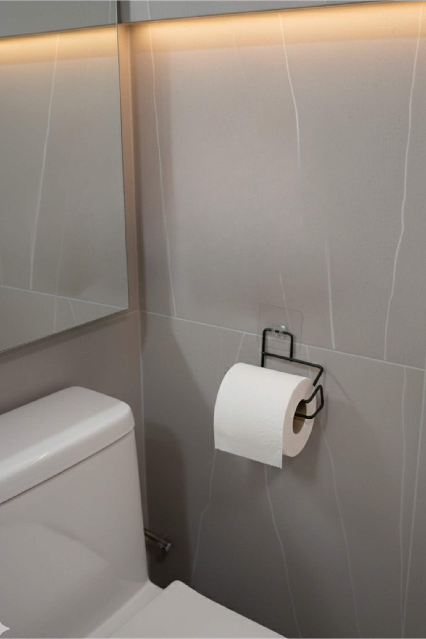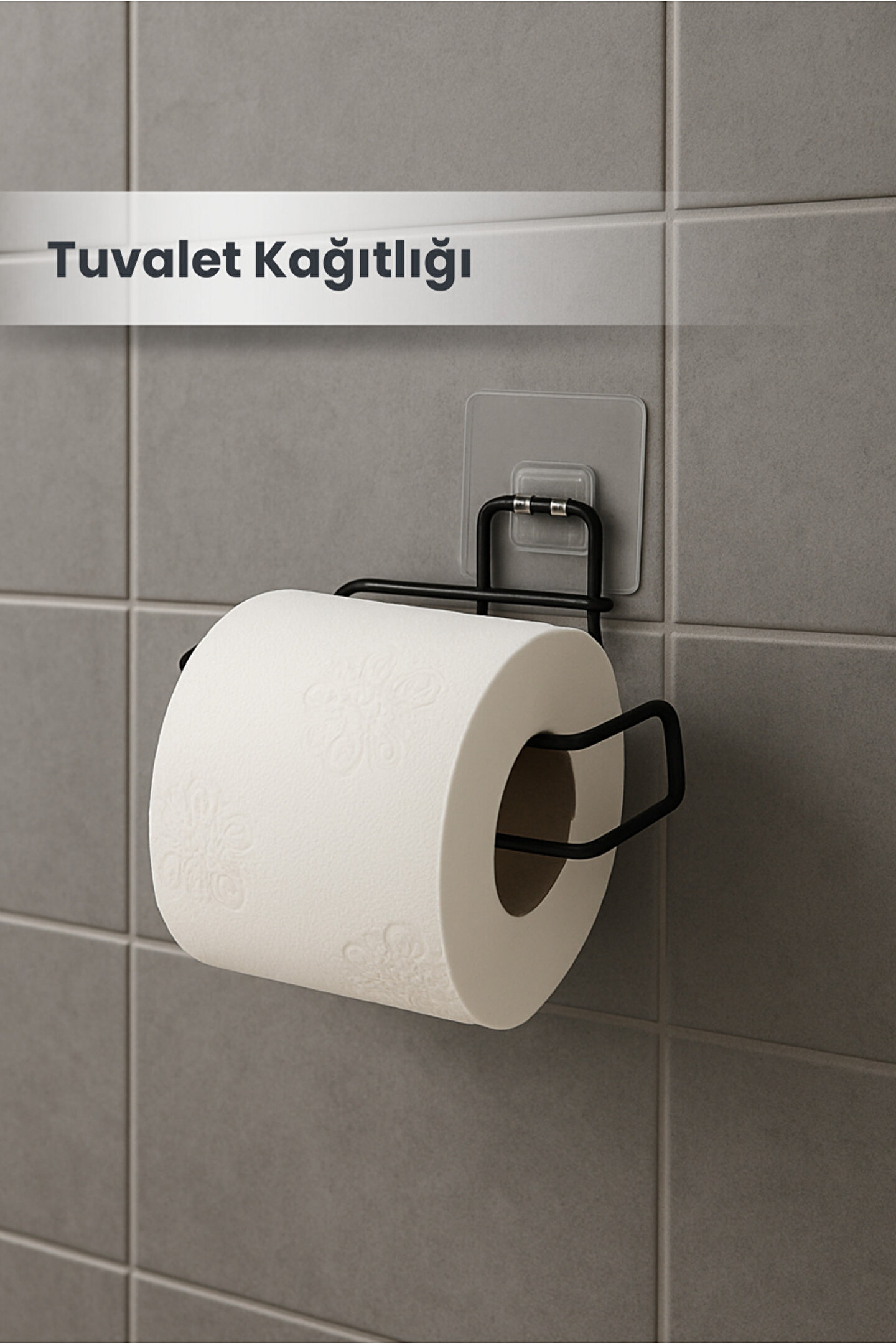 Yapışkanlı tuvalet kağıtlığı; modern ve minimal banyo dekorasyonu için özel tasarım; siyah mat elektrostatik boyalı metal gövde; şık ve zamansız görünüm; delme, vidalama ve matkap gerektirmeyen pratik montaj sistemi; yüksek tutunma gücüne sahip güçlü yapışkan yüzey; fayans, seramik, mermer, cam, metal ve düzgün yüzeylerde güvenle kullanım; duvara zarar vermez ve iz bırakmaz; nemli ve ıslak ortamlara dayanıklı paslanmaz metal yapı; banyo ve tuvalet kullanımına özel tasarım; standart tüm tuvalet kağıdı ruloları ile uyumlu ölçüler; kağıdın rahatça dönmesini sağlayan ergonomik tasarım; sallanma ve düşme yapmayan sağlam yapı; yerden tasarruf sağlayan duvara monte kullanım; modern bej, gri ve açık tonlu banyo duvarlarıyla uyumlu estetik duruş; ev, ofis, otel, kafe, restoran ve iş yeri kullanımı için ideal; uzun ömürlü ve dayanıklı malzeme; kolay temizlenebilir pürüzsüz yüzey; hijyenik kullanım avantajı; montaj sonrası hemen kullanıma hazır; sade, dekoratif ve fonksiyonel banyo aksesuarı.;