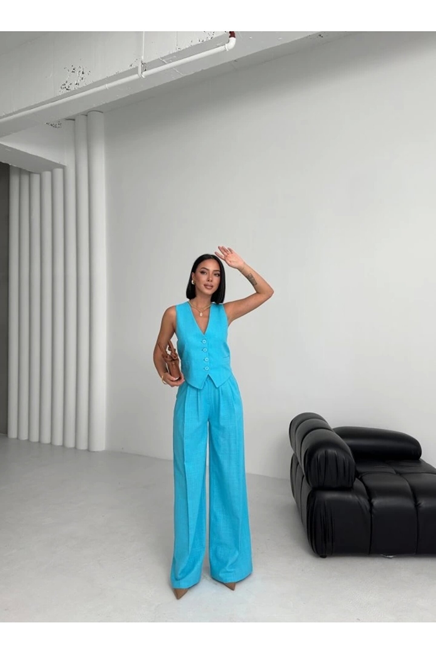 OUZ Fashion Kadın Keten Sırtı Çapraz Geçişli Cepken Pantolon İkili Takım
