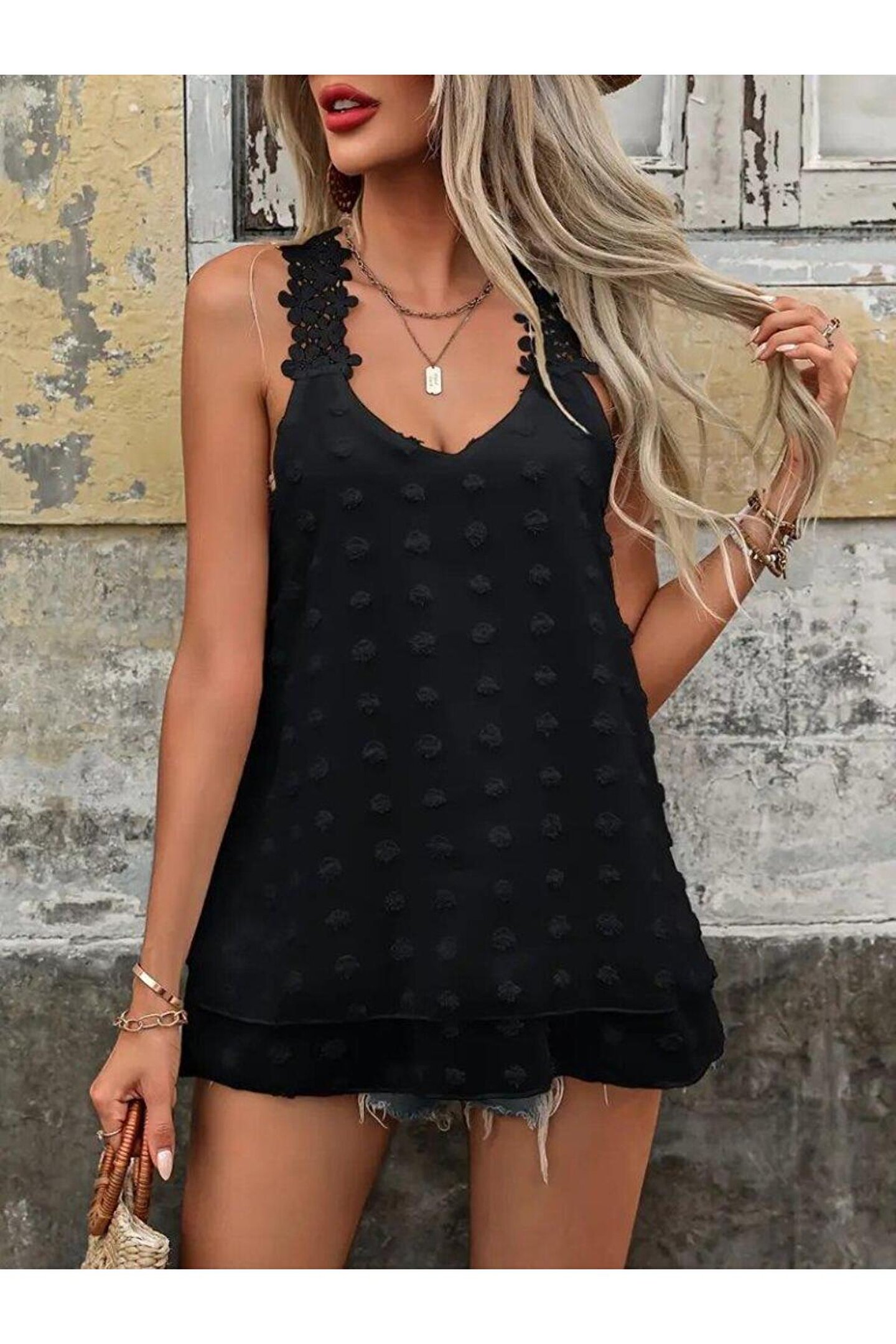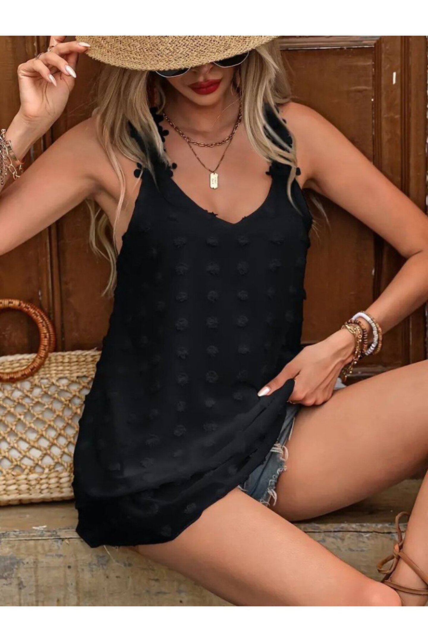 Kadın Dantel Askılı V Yakalı Sırtı çapraz Detaylı Ponpon Bluz