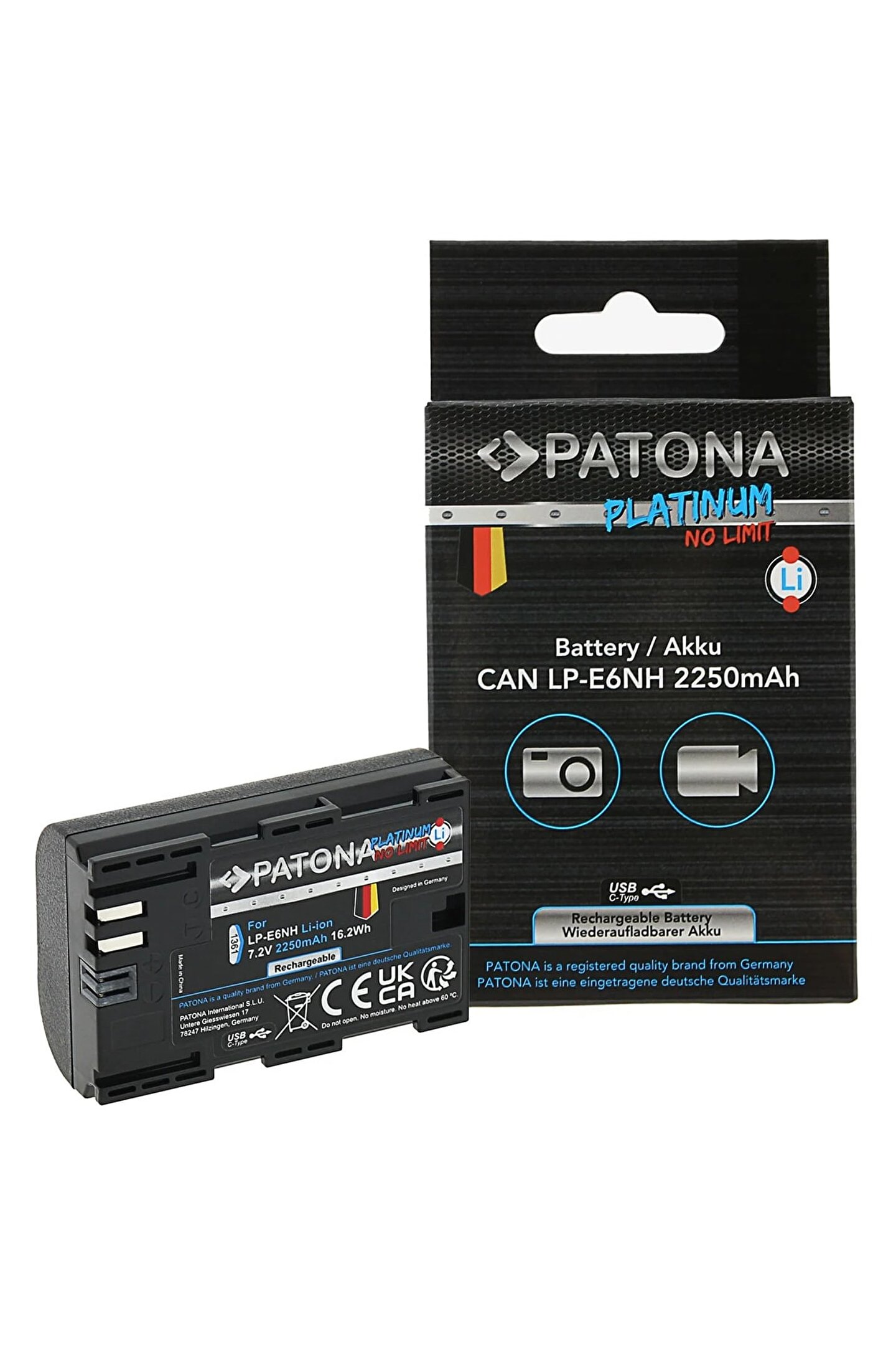 Patona Platinum Canon LP-E6NH USB-C Girişli Batarya Pil Platinum bataryalar orijinal bataryalardan daha yüksek kapasiteye sahiptir. ; -Samsung, LG, Sanyo, Panasonic gibi bilinen Premium pil hücreleri kullanılarak üretilmiştir. ; -En yüksek şarj olma döngüsüne sahiptir ve 2 yıllık bir süre sonrasında orijinal kapasitesinin %80’ini korur. ; Yüksek kapasiteli 2250mAh / 7,2V / 16,2Wh USB-C Girişi: max. ; 1,2 A (Daha yüksek giriş akımları, pilin IC kontrolüyle otomatik olarak azaltılır). ; şarj LED'li Tip: Li-ion Marka: PATONA Platinum Uyumlu Makinalar Canon EOS R5, R6, R6II Not: Video modunda Canon EOS R5 C ile uyumlu değildir.;