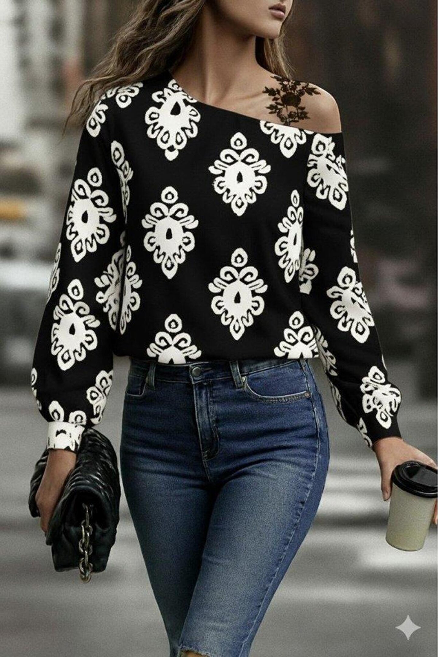 Kadın Askılı Uzun Kollu Omuzlardan Açık Desenli Mosskrep Bluz