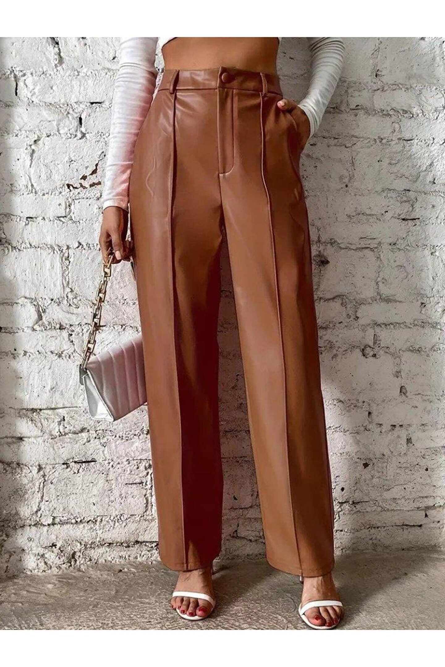Pazarcan Kadın önden Fermuarlı Cepli Geniş Kesim Lame Deri Pantolon