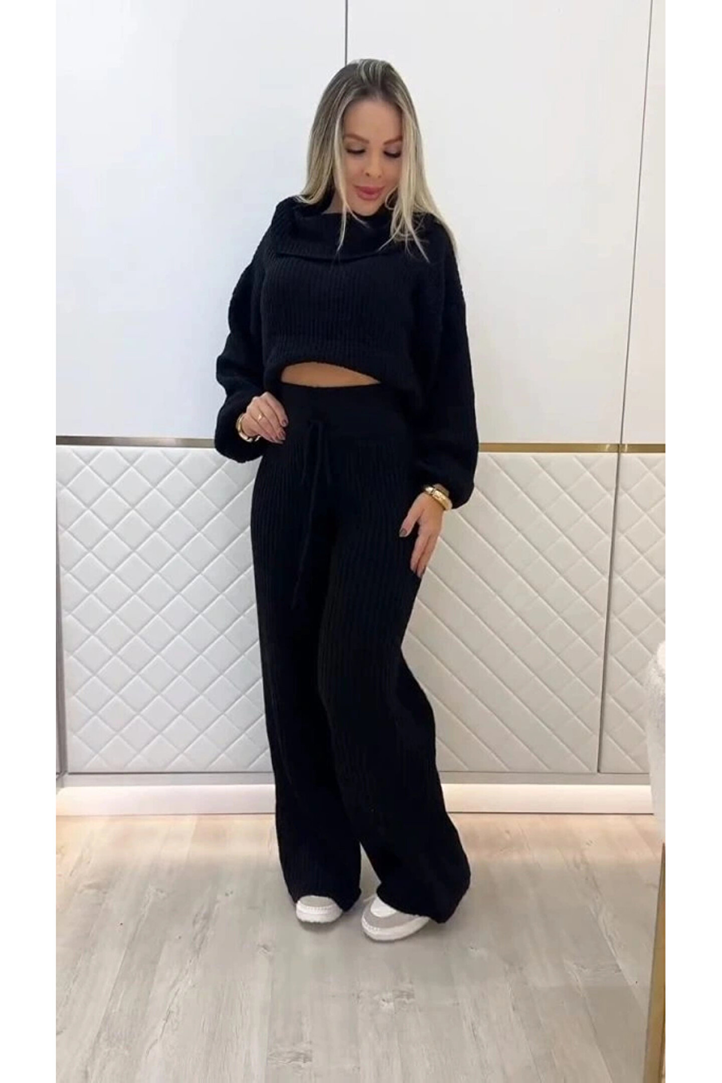 Kadın Uzun Kollu Balıkçı Yaka Kısa Triko Bluz Ve Pantolon Ikili Takım