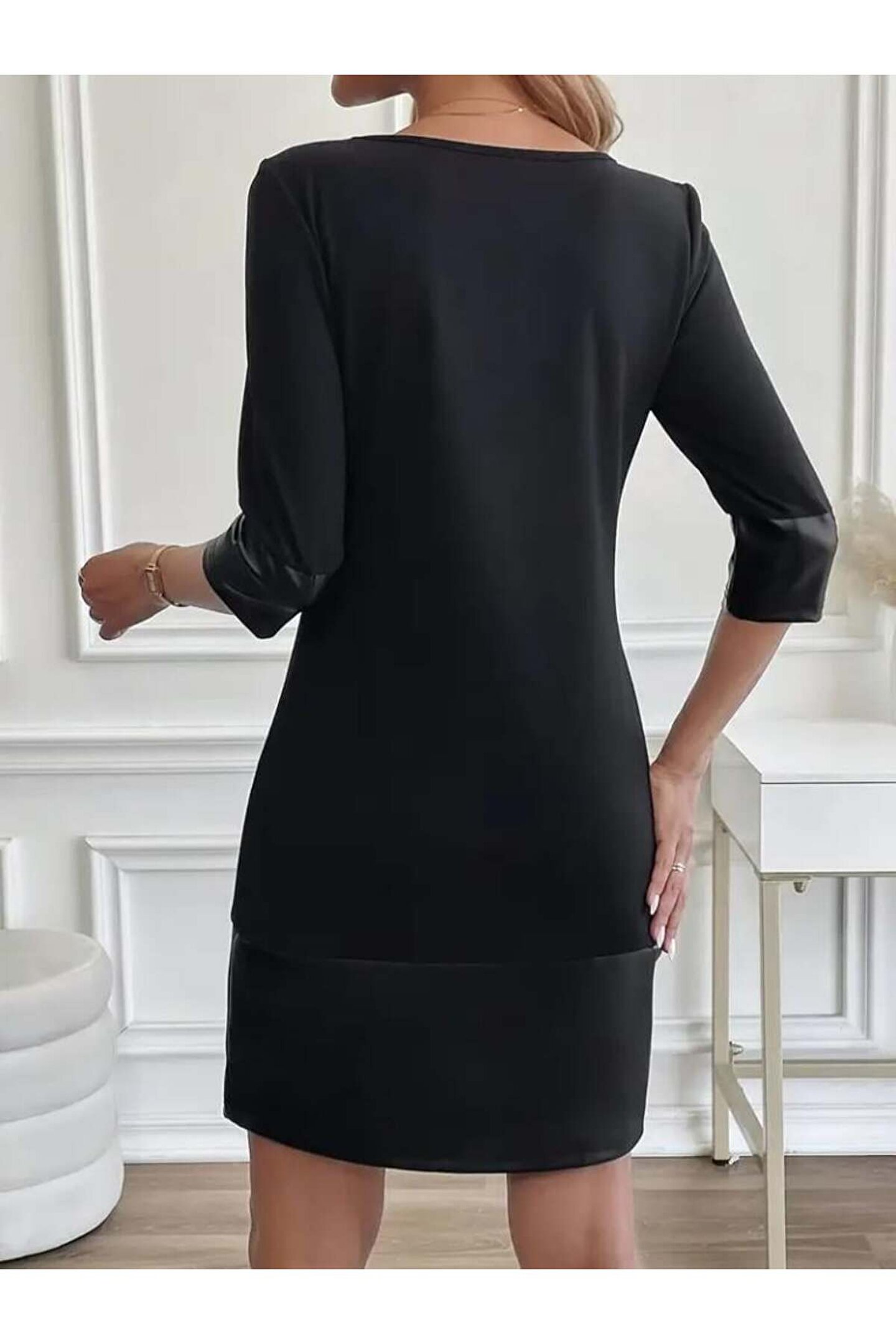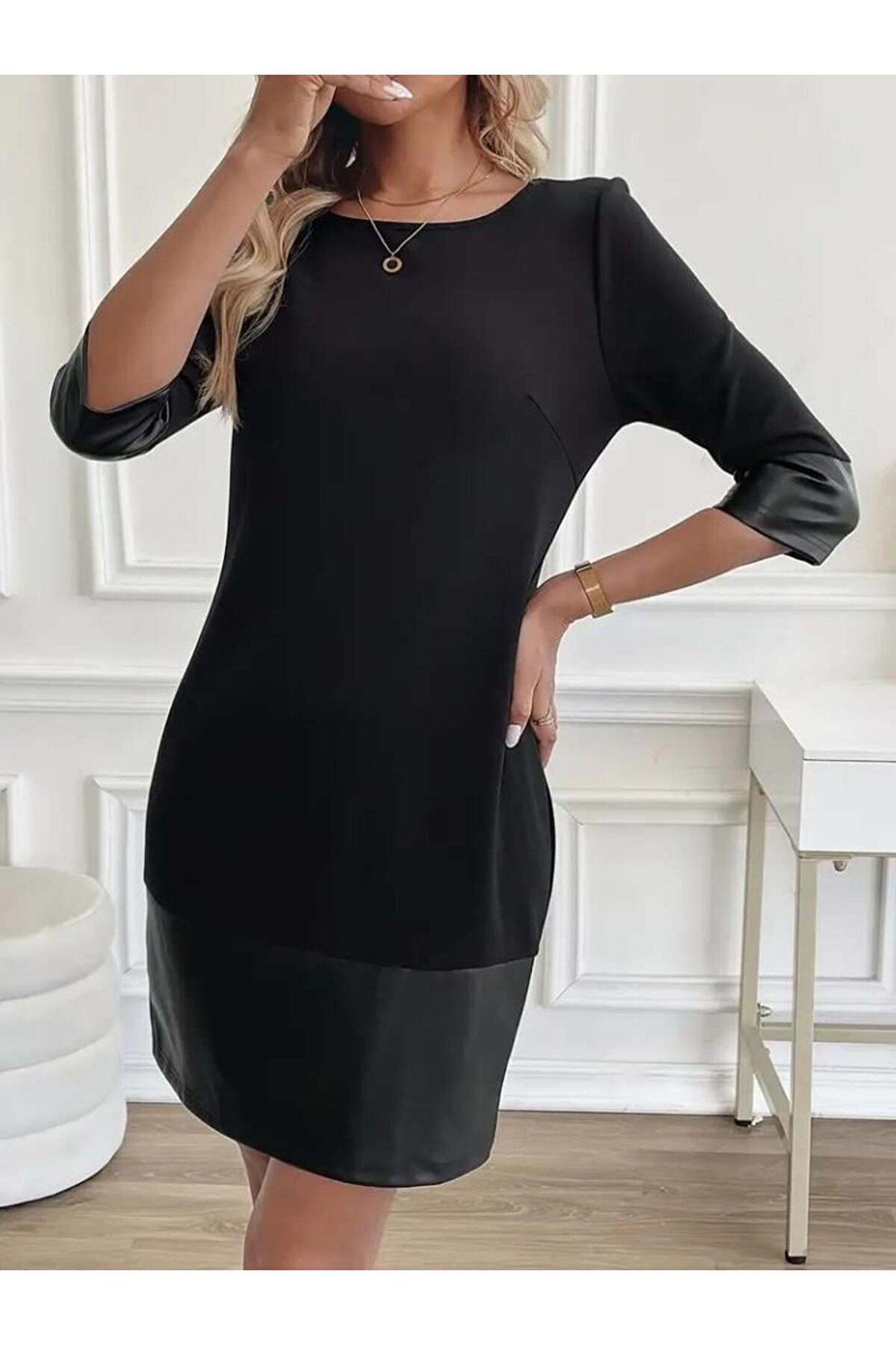 Kadın Uzun Kollu Bisiklet Yaka Deri Detaylı Ithal Krep Elbise Hediye Paketi Yapılabilir.