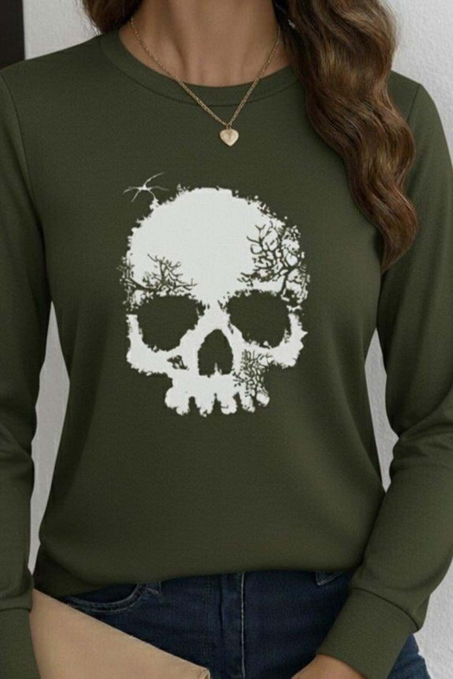 Kadın Uzun Kollu Bisiklet Yaka Kurukafa Desenli Viskon Bluz