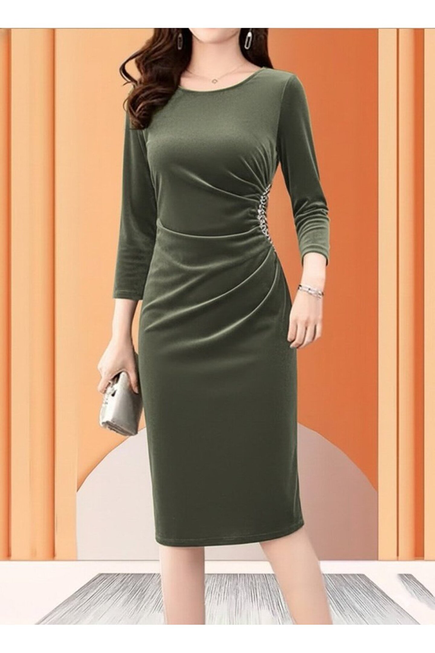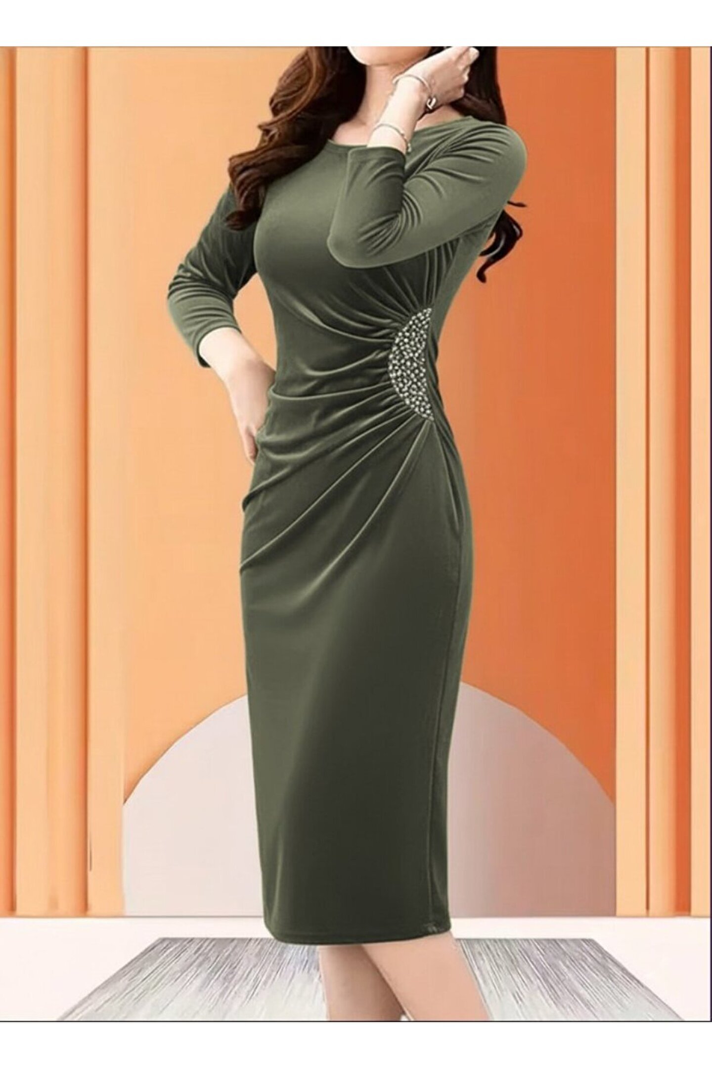 Kadın Uzun Kollu Bot Yaka Yanı Taş Detaylı Midi Kadife Elbise