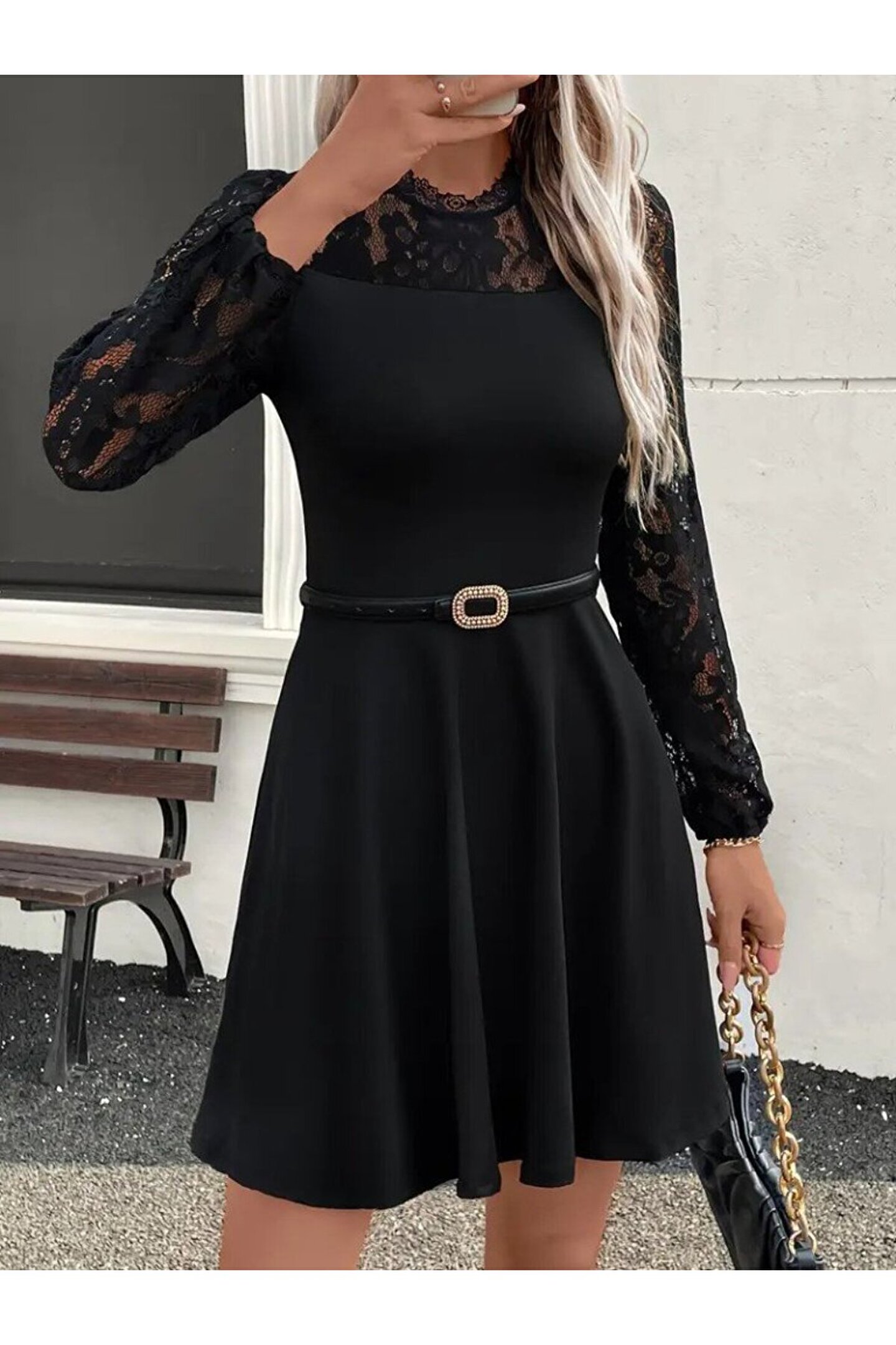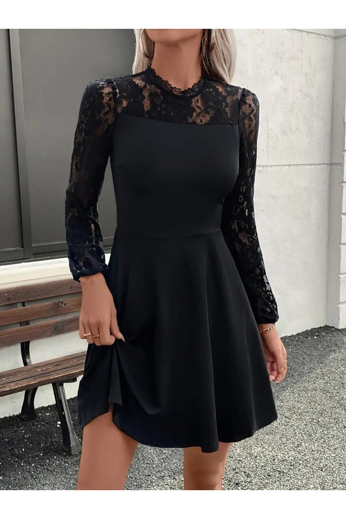 Kadın Uzun Kollu Dantelli Kloş Mini Ithal Krep Elbise