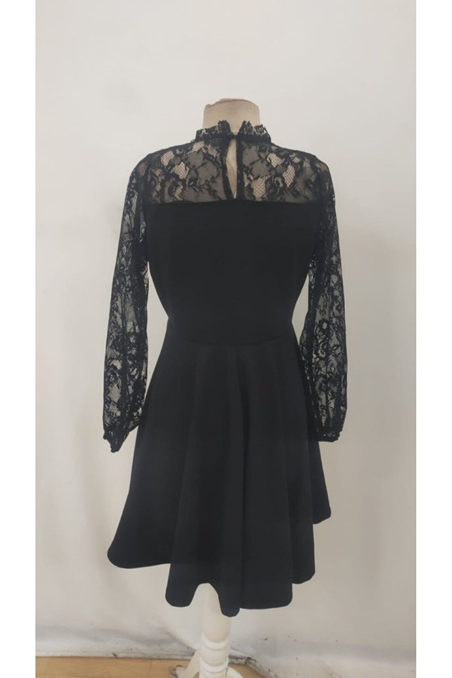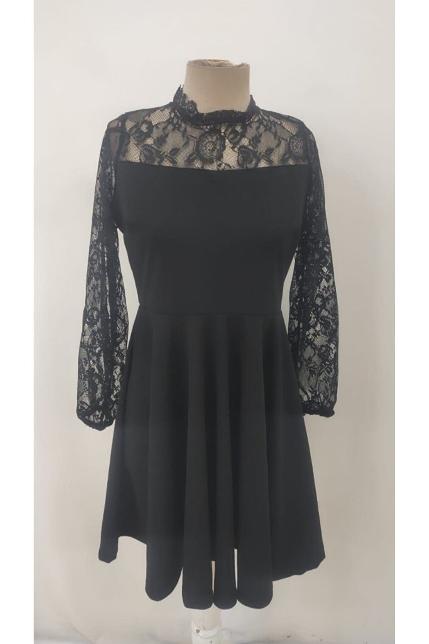 Pazarcan Kadın Uzun Kollu Dantelli Kloş Mini Ithal Krep Elbise
