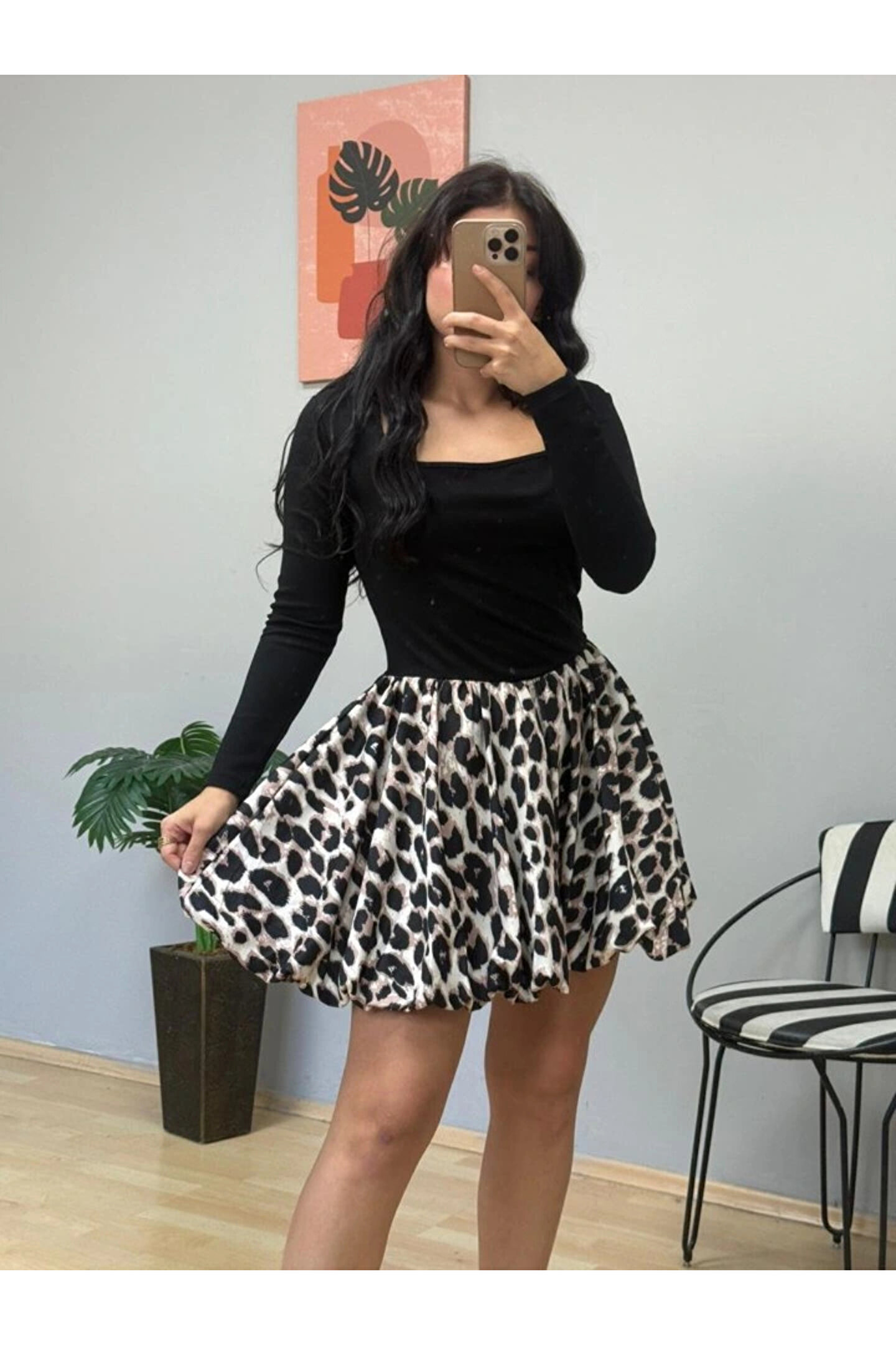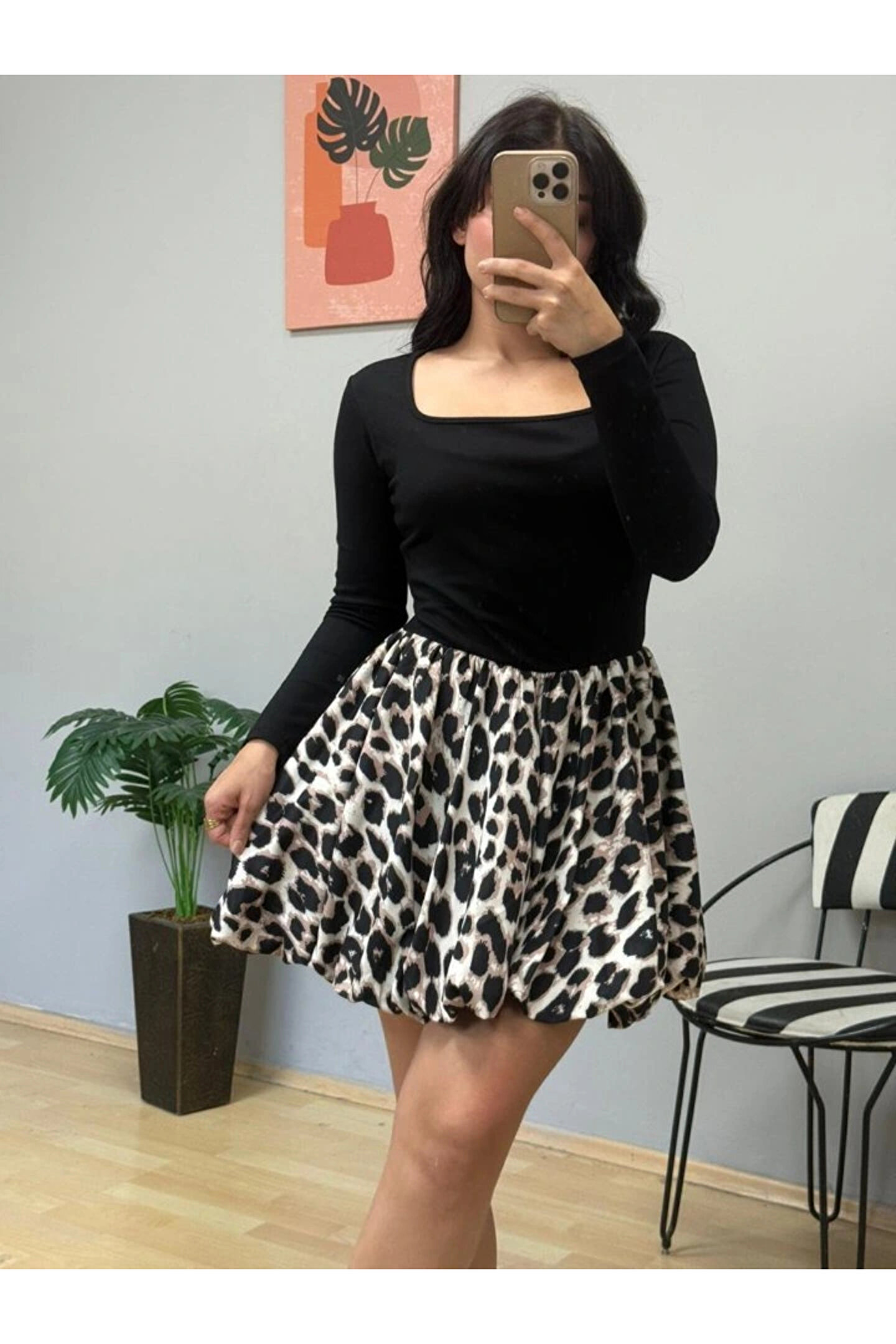 Kadın Uzun Kollu Kare Yaka Mini Balon Modal Elbise
