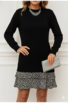 Pazarcan Kadın Uzun Kollu üst şardonlu Kaşkorse Alt Süprem Desenli Elbise