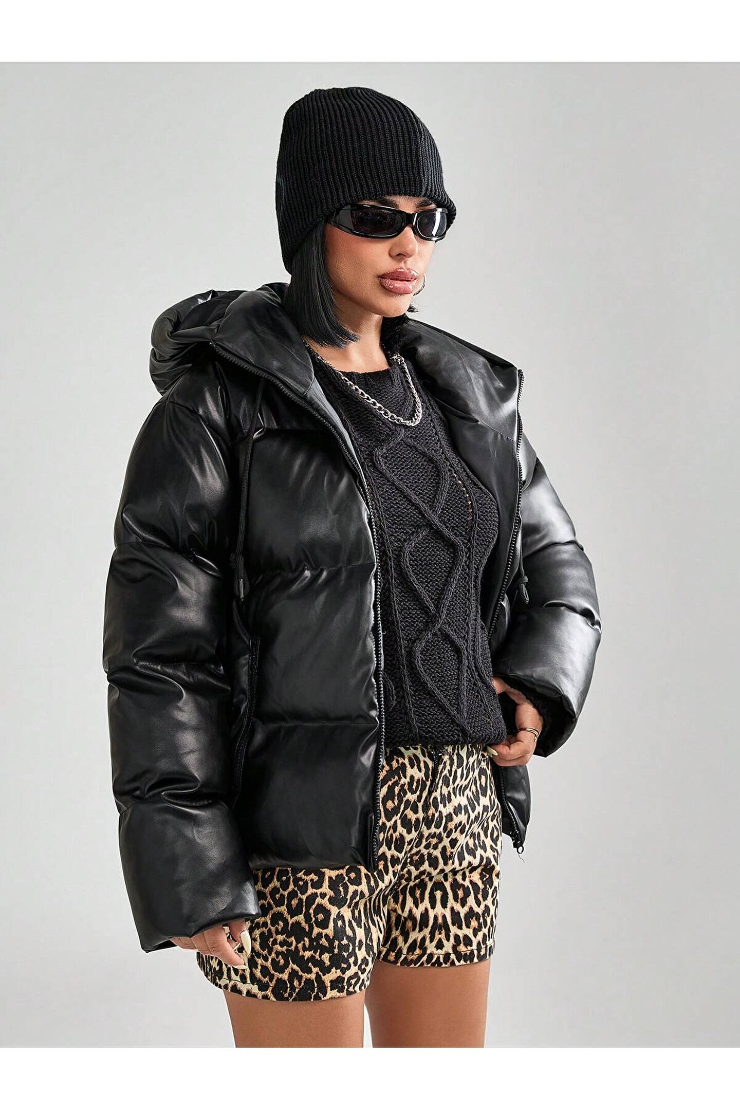 PERÇEM Kadın Kapüşonlu Şişme Deri Mont