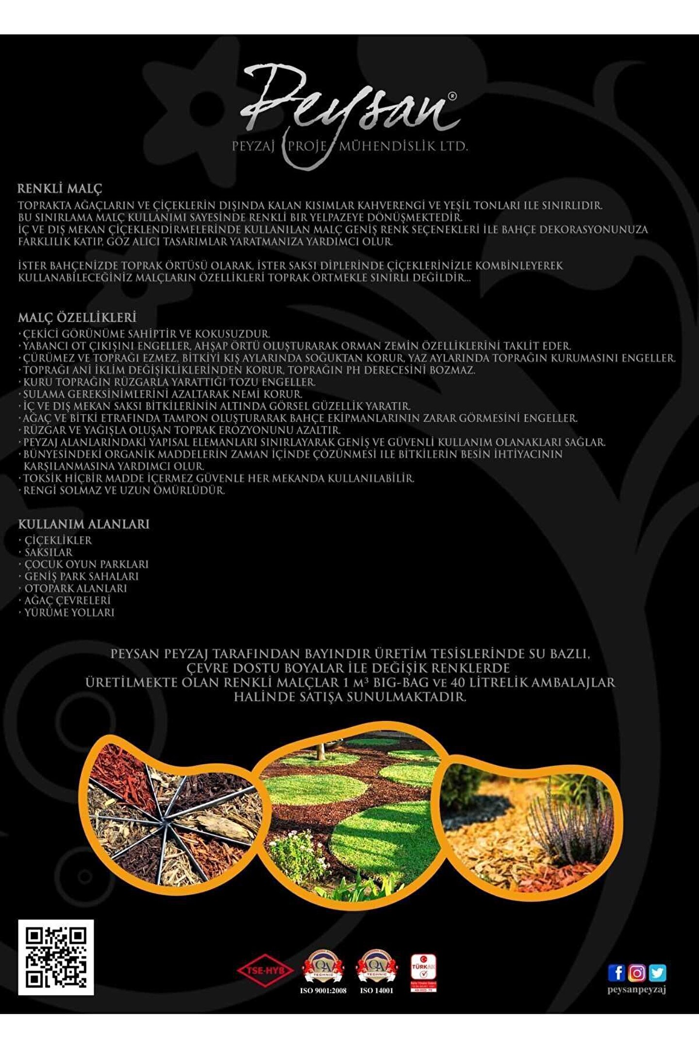 Peysan Renkli Malç Kullanma Talimatı 1. Malçın Hazırlanması: Peysan renkli malç, çeşitli bitki örtüsü ve dekoratif alanlarda kullanılmak üzere tasarlanmış doğal bir malçtır.; Uygulamaya başlamadan önce malçın nemli olmadığından emin olun.; Nemli malç, uygulama sırasında topaklanmalara yol açabilir.; 2. Alanın Hazırlanması: Uygulama yapılacak alanı temizleyin.; Yabani otlar, taşlar ve diğer istenmeyen bitkisel malzemeleri kaldırın.; Zemin mümkün olduğunca düz ve pürüzsüz olmalıdır.; Gerekirse, malç uygulamadan önce zemine geotekstil malzeme veya yabani ot bariyeri serilebilir.; 3. Malç Uygulaması: Peysan renkli malç, genellikle 5-10 cm kalınlığında uygulanmalıdır.; Daha kalın bir tabaka suyun topraktan geçmesini engelleyebilir, daha ince bir tabaka ise yabani otları baskılamakta yetersiz kalabilir.; Malçı el veya uygun bir bahçe aracı kullanarak eşit bir şekilde dağıtın.; Bitki köklerine çok yakın yerleştirmemeye özen gösterin, bitki kökleri havalandırmaya ihtiyaç duyar.; 4. Düzenleme ve Bakım: Zamanla malç tabakasında sıkışma veya kayma olabilir.; Bu durumda malçı hafifçe tırmıklayarak veya ellerinizle yeniden düzenleyebilirsiniz.; Malç, 1-2 yıl içerisinde doğal olarak parçalanmaya başlar ve incelir.; İhtiyaç duydukça yeni malç ekleyerek tabakayı koruyun.; 5. Sulama: Uygulama sonrasında malçın yerleşmesini sağlamak için hafifçe sulayın.; Su malçtan geçerek toprağa ulaşmalı; bu nedenle sulama miktarını kontrol edin.; 6. Avantajlar: Peysan renkli malç, toprağın nemini korumaya yardımcı olur, yabani otların büyümesini engeller ve estetik bir görünüm sunar.; Ayrıca toprağın sıcaklık dalgalanmalarını dengeleyerek bitkiler için daha sağlıklı bir ortam sağlar.; Bu talimatları takip ederek Peysan renkli malç uygulamasından en iyi sonuçları alabilirsiniz.
