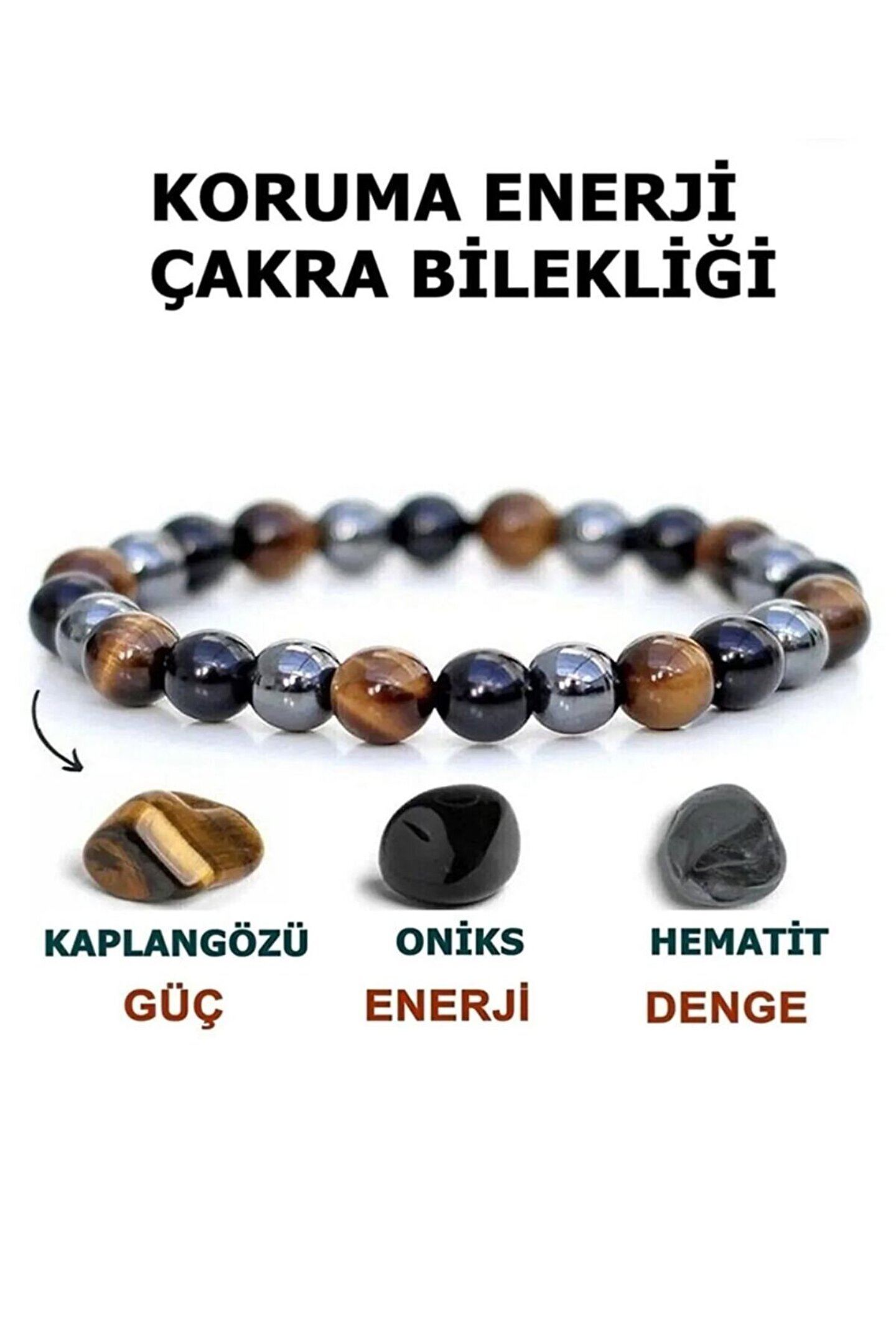 - Doğal taş kullanımı sayesinde hem şıklığı hem de enerjisi bileğinizde taşıyın.; - Kaplangözü, Oniks ve Hemitite sahip bu bileklikle enerjinizi dengeleyin ve koruyun.; - Unisex tasarımı ile herkes tarafından rahatlıkla kullanılabilir; cinsiyet ayrımı yapmaz.; - Yetişkin yaş grubuna hitap eden bu bileklik, günlük kullanım için idealdir.; - Doğal taşların estetiğiyle bileğinizde zarif bir görünüm sağlayın.