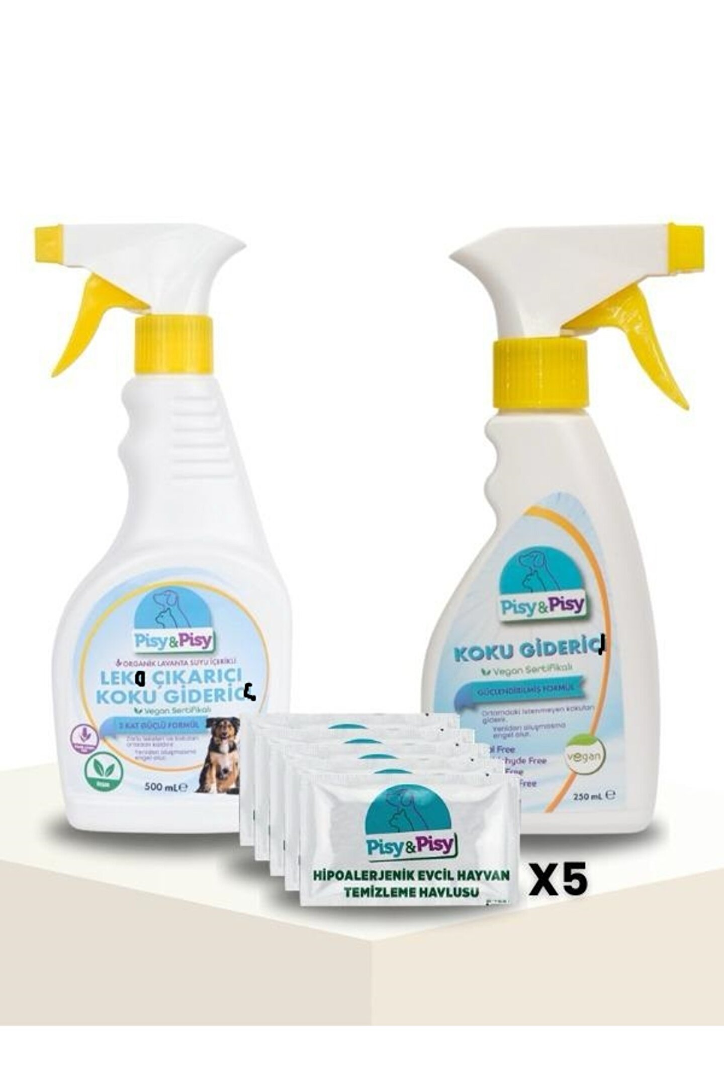 L*KE ÇIKARICI ve KOKU G*DERİCİ 500 mL ; VEGAN SERTİFİKALI KOKU G*DERİCİ 250 mL ; 5 ADET TEKLİ ANTİALERJEN ALEO VERA ESANSLI HİPOALERJENİK EVCİL HAYVAN TEMİZLİK HAVLUSU ;