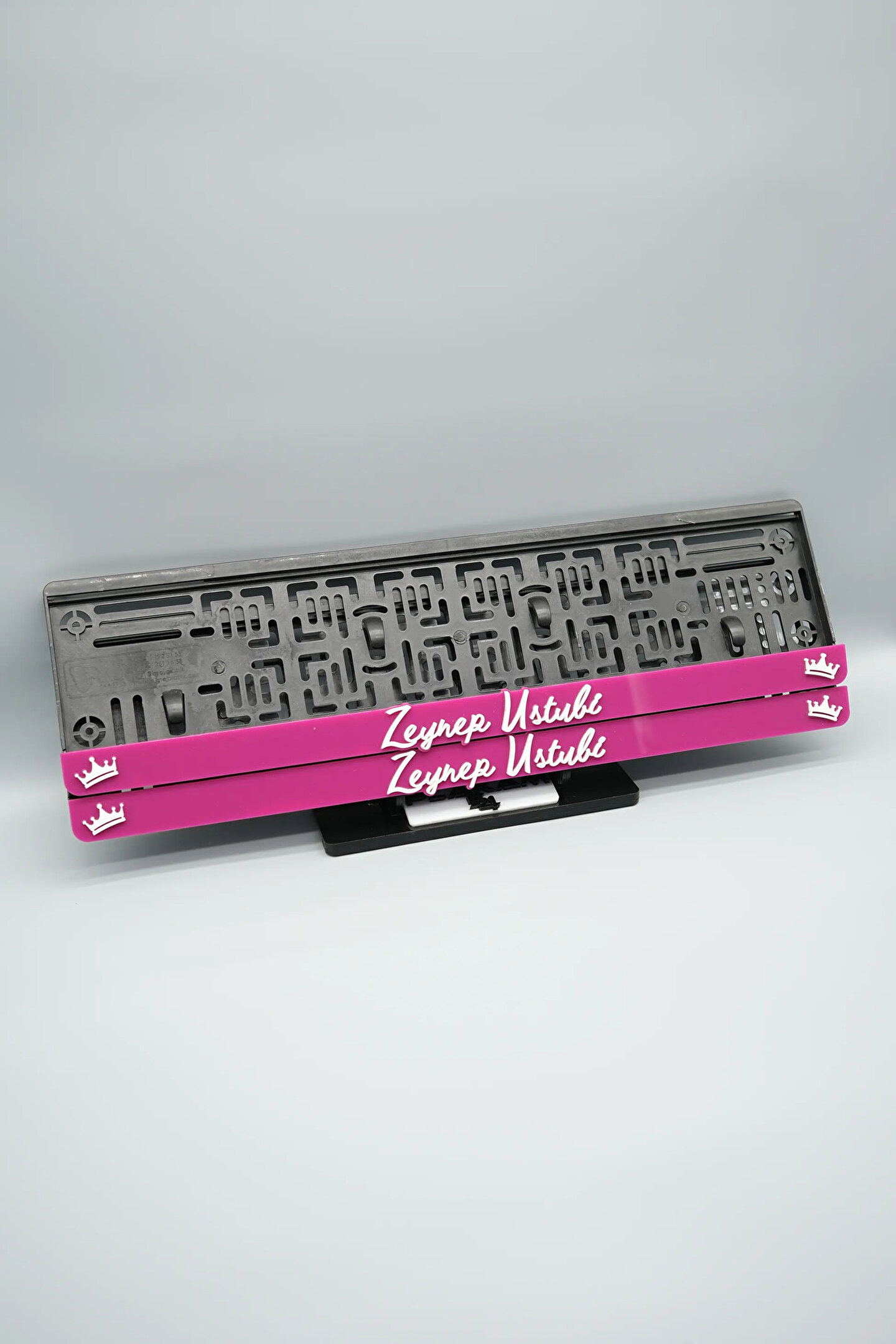 Sıradanı Sıradışıya Çevir! Lazer Kesim Plakalıklarımızla Tanışın!; Özellikler:; Alt çıta ve plakalık olmak üzere toplam 4 parçadan oluşur.; 3D kabartmalı veya gümüş tasarımı ile dikkat çeker.; UV baskı değil, silinme veya dökülme yapmaz.; Standart araba plakası ölçülerindedir (11x52 cm plakalar için uygundur).; Kalite ve Şıklığı Bir Arada Sunuyoruz:; Ürünlerimiz, parlak 1. sınıf kalitede pleksiyi lazer kesim kullanılarak özel yapıştırıcılarla birleştirilerek üretilir.; Sadece plaka değil, aracınıza özgü bir tarz katmanın en havalı yolu!; Dayanıklılıkta Sınır Tanımıyoruz:; Uzun süreli kullanıma uygun olan plakalıklarımız, özel yapıştırıcı teknolojisi ile birleşerek aracınızın stilini korur.; Silinme veya dökülme gibi sorunlarla karşılaşmadan uzun ömürlü bir deneyim sunar.; 3D Kabartmalı Tasarım:; Plakalıklarımızın eşsiz 3D kabartma tasarımı, sizi diğer araçlardan farklı kılacak.; Görsel şölenimiz aracınıza estetik bir dokunuş katıyor.; Kolay Montaj, Büyük Etki:; Aracınıza özel tasarımı hemen kullanmaya başlamak için ürünlerimizin montajı oldukça basittir.; Size zahmetsiz bir kişiselleştirme deneyimi sunuyoruz.;Gerçek Görseller, Gerçek Ürün:; ürün görsellerimizle alacağınız ürün arasında çita malzeme fark yok.; Ürün özellikleri ile ilgili olan sorularınızı ürünün altında yer alan Satıcı Soruları bölümünü tıklayarak sorabilirsiniz.;Siparişiniz ile ilgili sorularınızı veya taleplerinizi Sipariş Detay'da yer alan Soru Sor bölümünden iletebilirsiniz.;Siparişi oluşturduktan sonra Örnek sipariş:"Sipariş numaram: 1111111111, Plakalık Üstüne Yazılacak yazı: ADINIZ SOYADINIZ Üstübi"şeklinde bizlere sipariş bilgilerinizi iletebilirsiniz.;Sipariş sonrası ürün soru sor kısmına üründeki seçmiş olduğunuz plakalığa yazılacak yazıyı belirtiniz.;Yazınızı belirtmediğiniz taktirde görselde yer alan modele siparişteki isim yazılarak gönderilecektir.; Farklı modeller için diğer ürünlerimizi inceleyebilirsiniz.;Ürünlerimiz takım olup 2 adet gönderilecektir.;Plaka çerçevesine yazmak istediğiniz en fazla 30 karakter giriniz; NOT Büyük Küçük harf Font uyumuna bağlıdır Küçük Harfler ile yazlı olan bilgileriniz font uyumlu ise küçük harflerde kullanılır.;Güvenle satın alın ve aracınızı şık ve özgün kılın.; Aracınızı Kişiselleştirin, Stilinizi Yansıtın!;