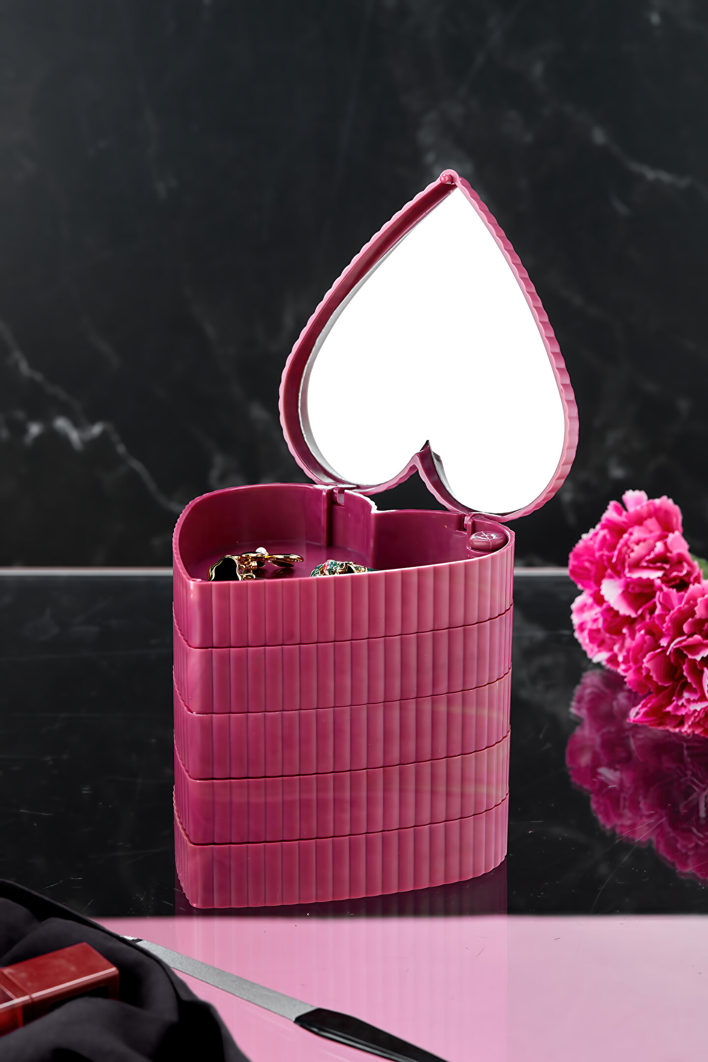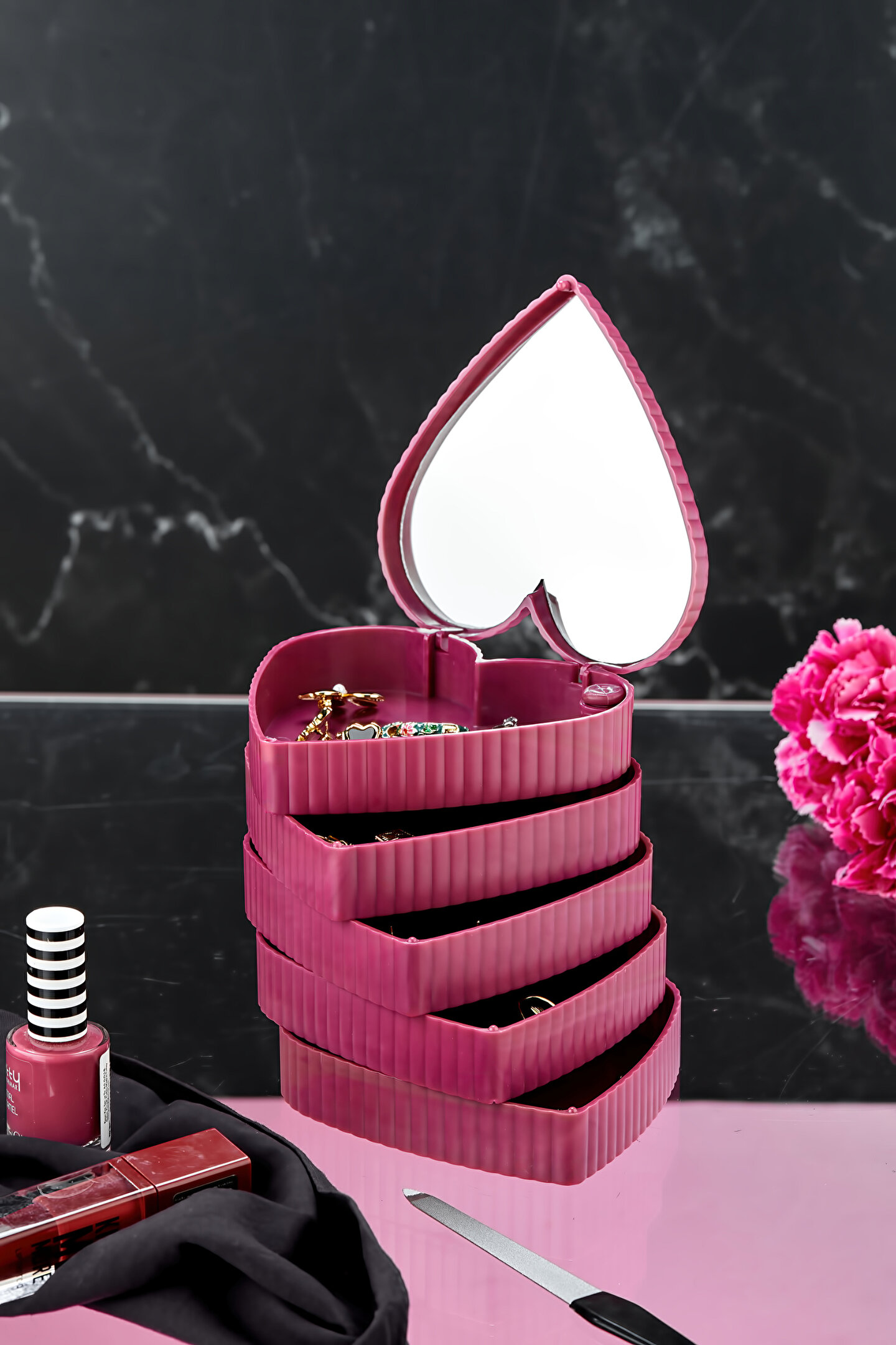 5 Katlı Aynalı Kalp 360 Derece Dönebilen Takı Organizer Kutusu Seyahat tipi taşınabilir aynalı organizer. ; Makyaj Aynalı ; Size pratik ve güvenli bir depolama alanı sunar. ; Boyutu sayesinde hem çok yer kaplamaz hem de şık bir dekorasyon eşyası olarak kullanılabilir. ; 360 derece dönebilen 4 katlı pratik bir üründür. ; Yüzük, küpe, saat, toka vb eşyalarınızı saklamak için ideal bir üründür. ; Takılarınız tozdan kirden uzak durur. ; Takılarını daha iyi muhafaza etmenizi sağlar. ; Ürün Ölçüleri: ; 11cm x 11cm x 12,4cm ; ok