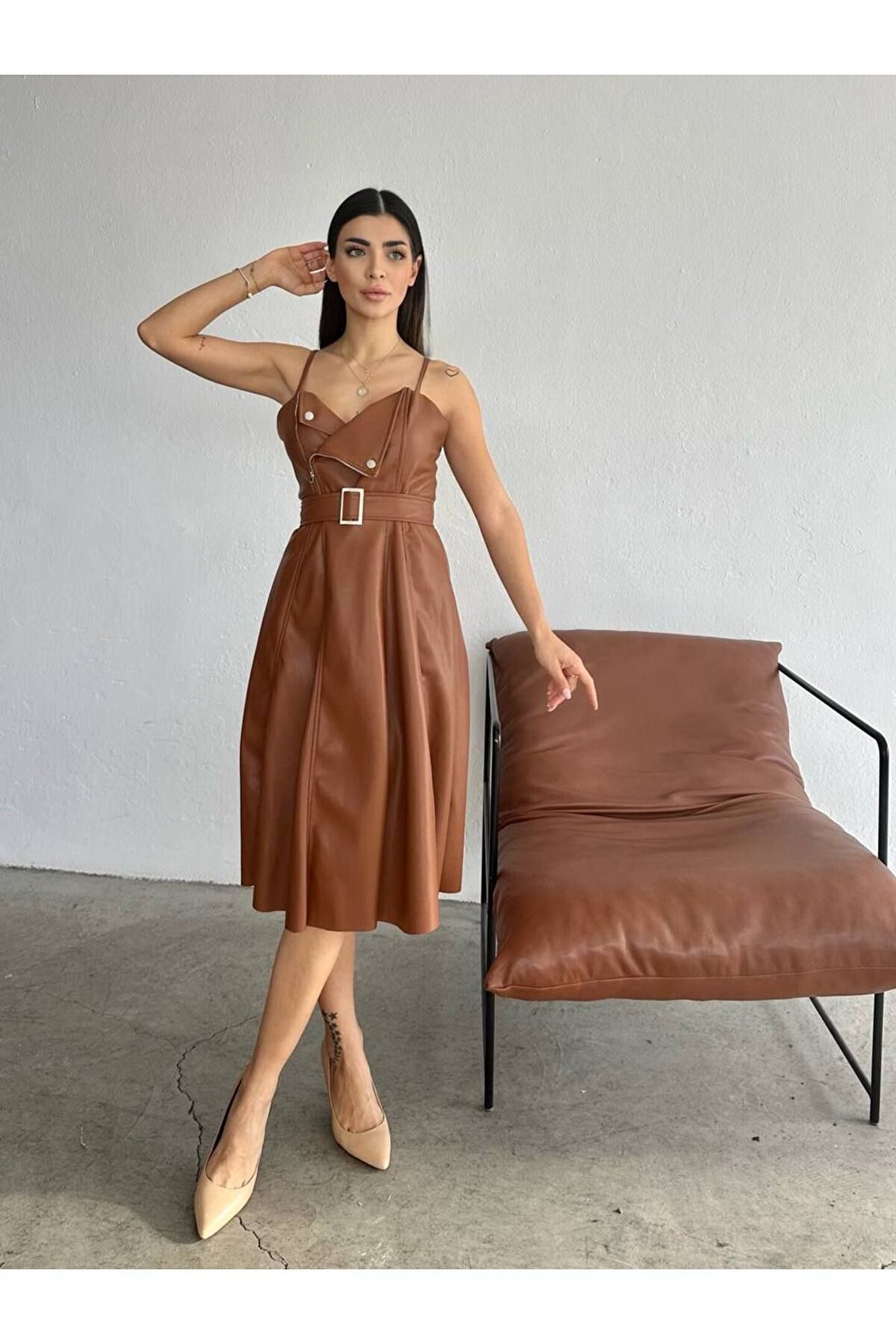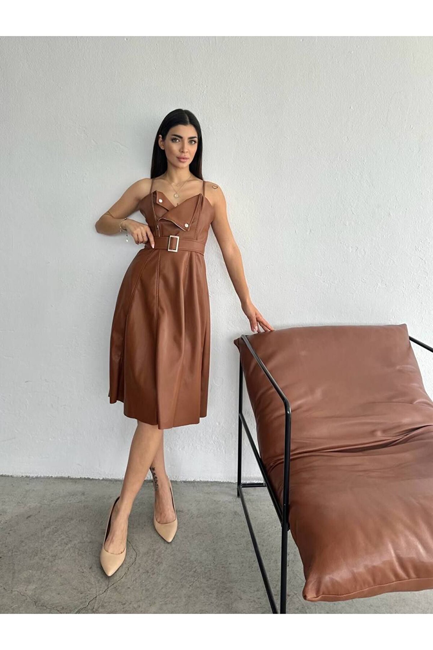 Askılı tasarımı ile modern ve şık bir görünüm sunar.; Suni deriden üretilmiş olup, dayanıklı ve kaliteli bir yapıya sahiptir.; Bele oturan kalıbıyla vücut hatlarını zarifçe sarar.; Her yaştan kadının rahatlıkla tercih edebileceği düz kesimiyle zamansız bir stil oluşturur.; Midi boyu ile hem günlük kullanım hem de özel davetlerde idealdir.;