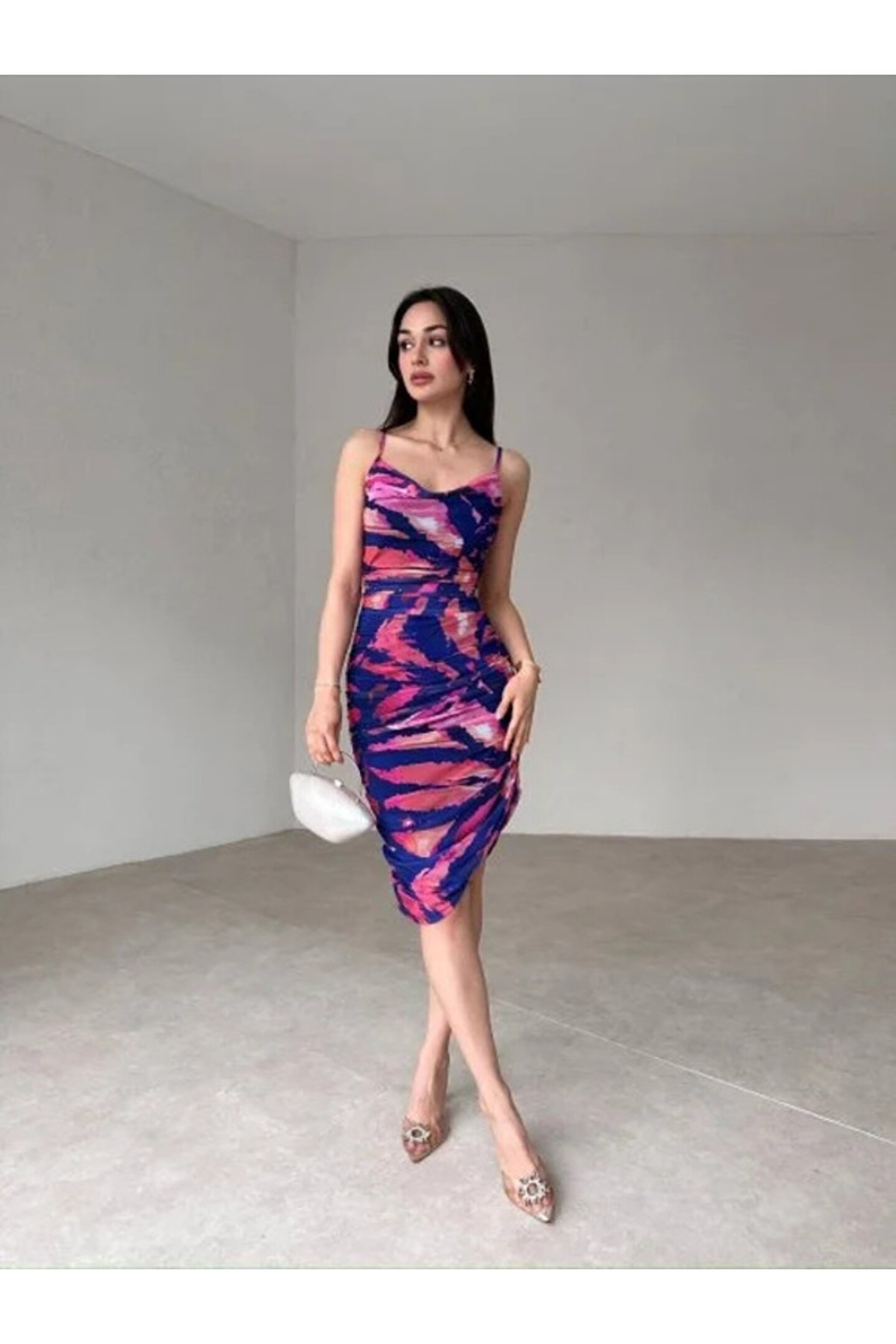 popibutik Askılı Drapeli Tül Kumaş Diz Altı Elbise