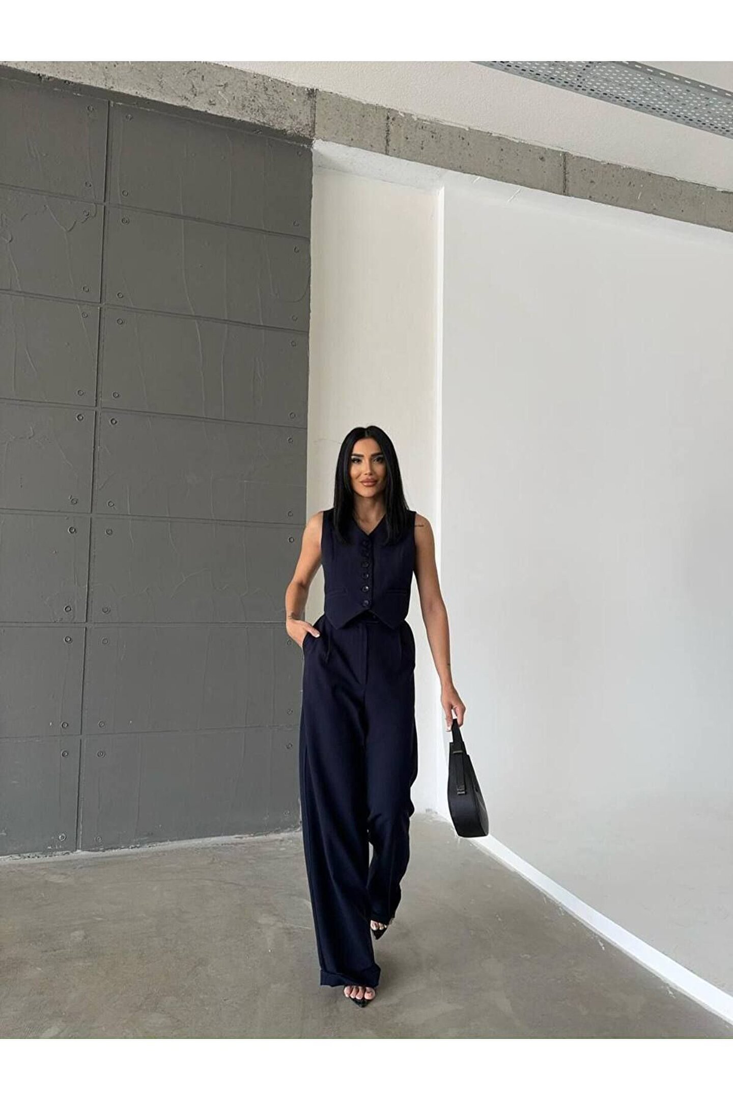 popibutik Atlas Kumaş Yüksel Bel İspanyol Paça Pantolon Yelek siyah Takım