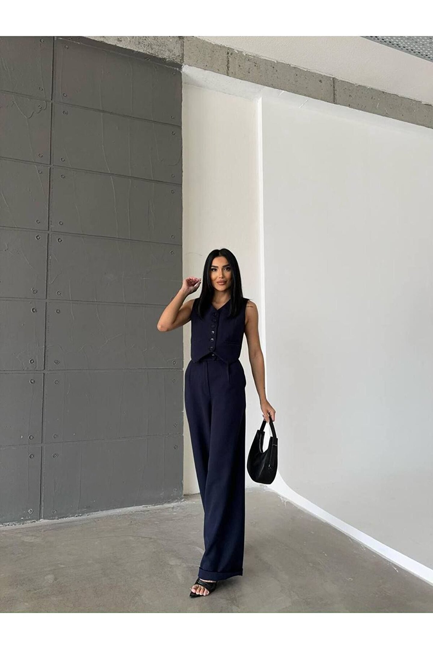 popibutik Atlas Kumaş Yüksel Bel İspanyol Paça Pantolon Yelek siyah Takım