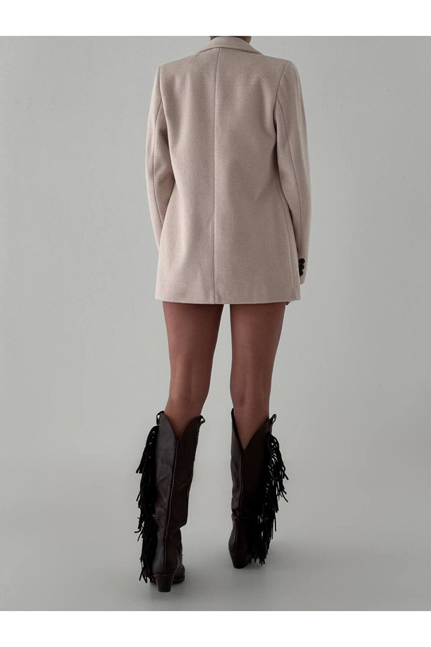 popibutik Balık Sırtı Desenli Astarlı Düğmeli Krem Kaşe Kumaş Kısa Boy Kaban