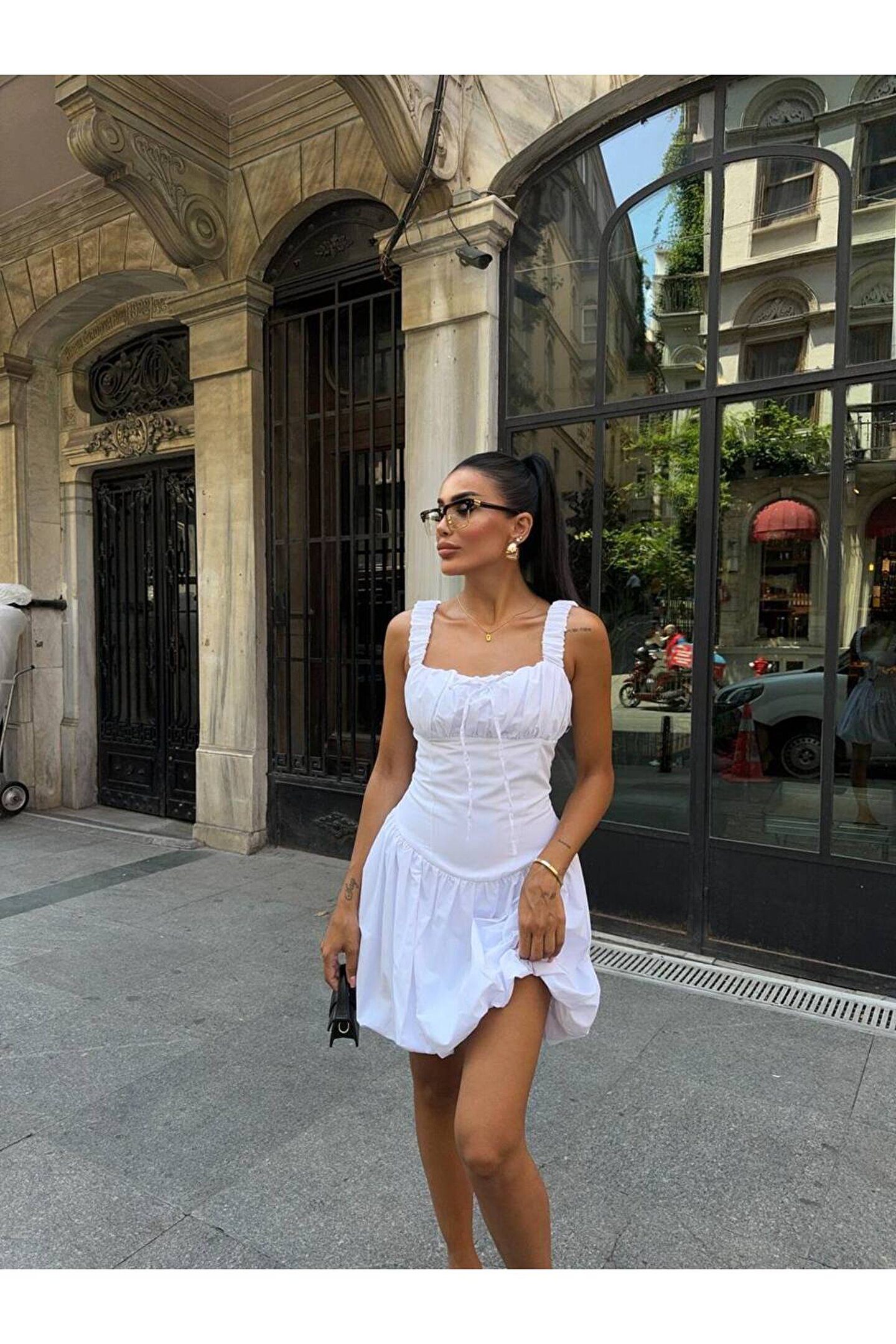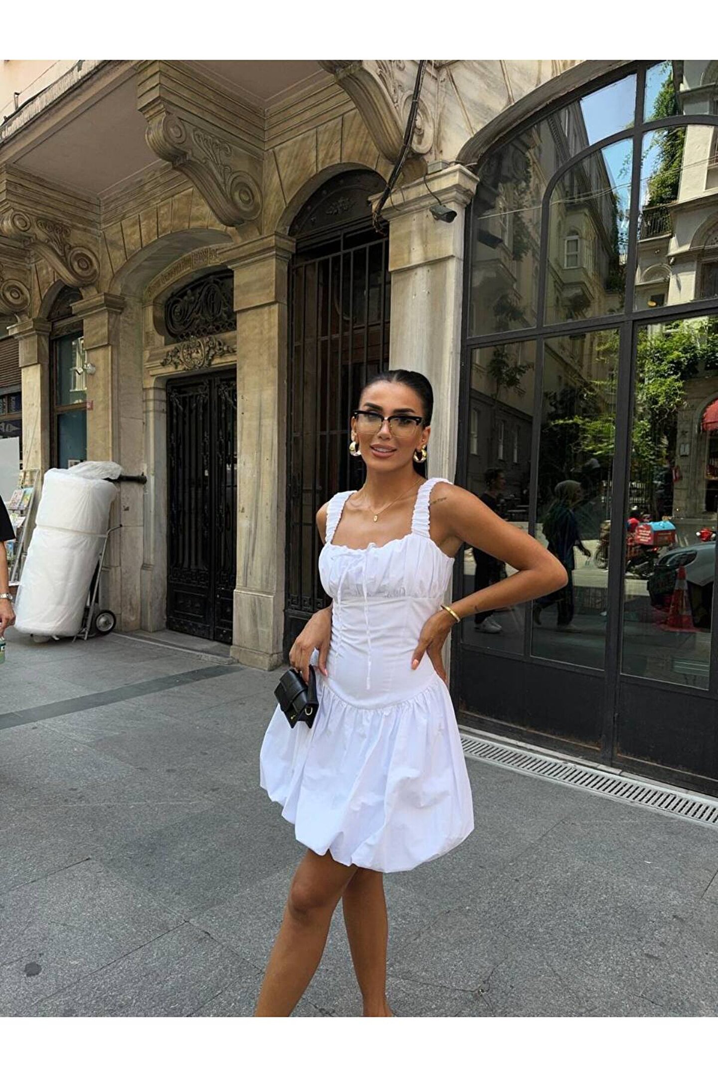 popibutik Balon Etek Kare Yaka Kalın Askılı Poplin Kumaş Mini Beyaz Elbise